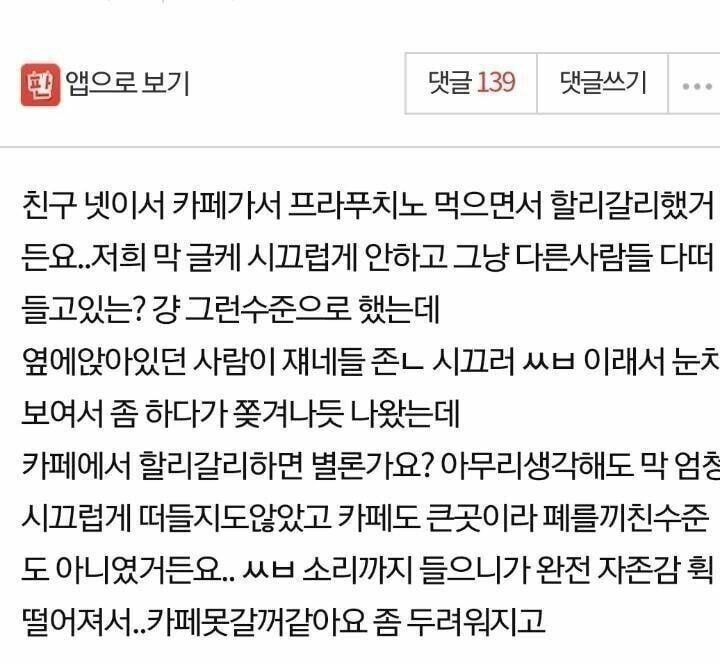 [스크랩] [기타]카페에서 조용히 놀았는데 욕먹었어요 작성자토쓰toss|작성시간24.11.14|조회수67,294 목록 댓글 82 글자크기 작게가 글자크기 크게가 출처 :여성시대 갤럭시를줄게 다음검색 스크랩 원문 : *여성시대* 차분한 20대들의 알흠다운 공간 현재 게시글 추가 기능 열기 북마크 공유하기 신고 센터로 신고 댓글 댓글 82 댓글쓰기 답글쓰기 댓글 리스트 작성자올래올래 | 작성시간 24.11.14 아진짜ㅋㅋㅋㅋㅋㅋㅋㅋㅋㅋㅋ개웃겨 작성자rigel kim | 작성시간 24.11.14 할리갈리를 어떻게 조용히해… 작성자고양이냐옹 | 작성시간 24.11.14 보드게임 카페에 가세요ㅋㅋㅋㅋ조용할수가 없잖아ㅋㅋㅋㄱㅋ 작성자노지귤 | 작성시간 24.11.14 할리갈리요? 작성자프랑스리라 | 작성시간 24.11.14 ㅅㅂㅋㅋㅋㅋㅋㅋㅋㅋㅋ 댓글 전체보기