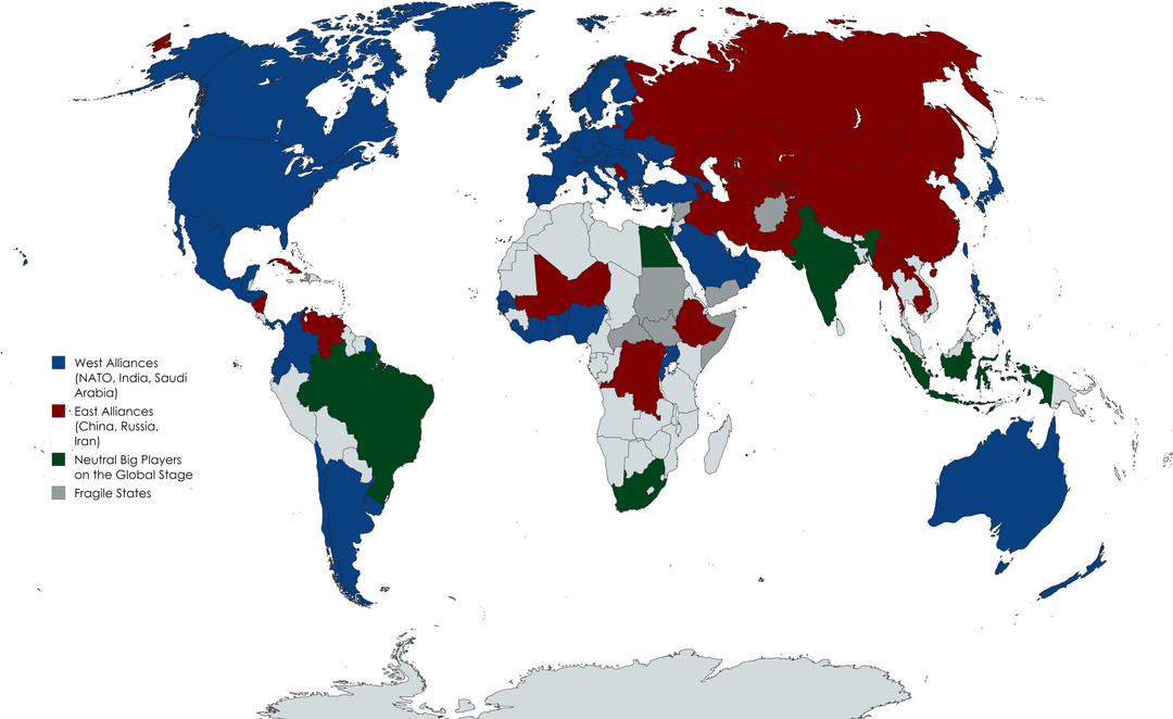 [ 파란색 : 미국이 주도하는 서구 진영 vs 빨강색 : 중국이 주도하는 반서구 진영 vs 초록색 : 어떤곳에도 속하지 않는 3세계 ]