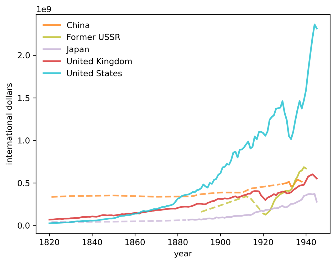 [ 1820-1940년 미국, 영국, 일본, 중국, 러시아 (소련) GDP ]