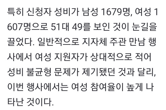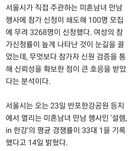 [여시뉴스데스크]"서울시가 신원 보증한 맞선"…만남 행사 경쟁률 33대 1 작성자붕어빵팔아줘|작성시간24.11.15|조회수2,285 목록 댓글 14 글자크기 작게가 글자크기 크게가 출처: https://n.news.naver.com/article/079/0003958959?sid=004"서울시가 신원 보증한 맞선"…만남 행사 경쟁률 33대 1서울시가 직접 주관하는 미혼남녀 만남 행사에 참가 신청이 쇄도해 100명 모집에 무려 3268명이 신청했다. 여성의 참가신청률이 높게 나타난 것이 눈길을 끌었는데, 무엇보다 참가자 신원 검증을 n.news.naver.com 다음검색 현재 게시글 추가 기능 열기 북마크 공유하기 신고 센터로 신고 댓글 댓글 14 댓글쓰기 답글쓰기 댓글 리스트 작성자오리엔탈 드레싱 샐러드 | 작성시간 24.11.15 화이팅~~~¡¡ 잘어울려용 작성자뜨그덕 뜨그덕 | 작성시간 24.11.15 연령대 30~34세가 제일 많다니. 작성자몽이몽몽2 | 작성시간 24.11.15 해봤자 직업, 소득정도만 봤을텐데 의대생도 지 여친 죽이는마당에 뭘 믿고... 작성자룰루15 | 작성시간 24.11.15 출생률 누군가는 높여줘야하니까 굿굿:) 작성자찴디킨스 | 작성시간 24.11.16 공짜 결정사라서 신청 많이 했나보네 댓글 전체보기