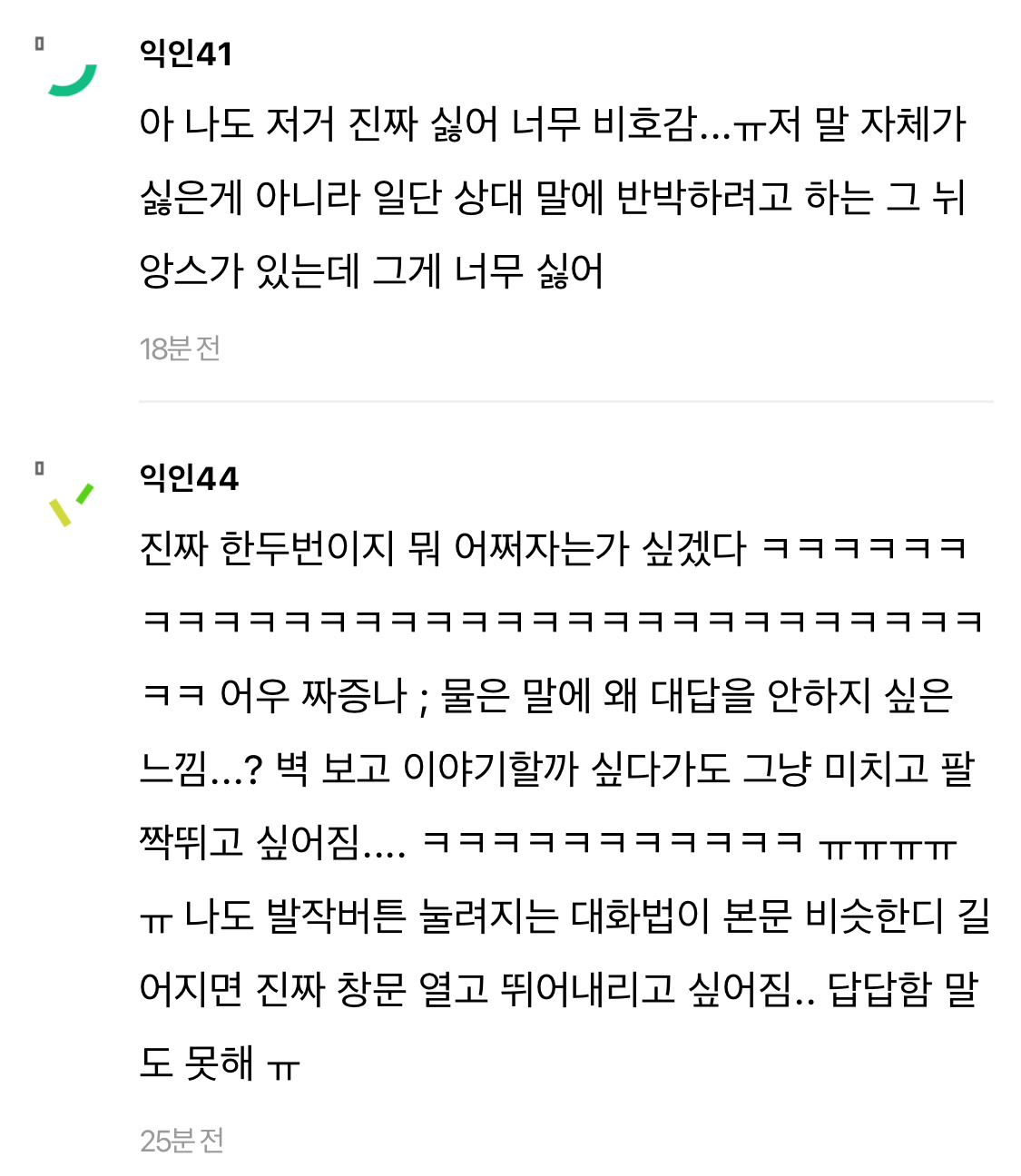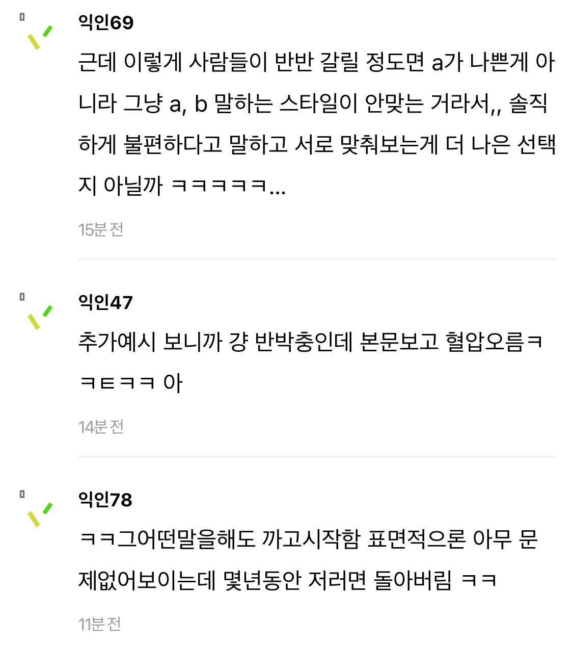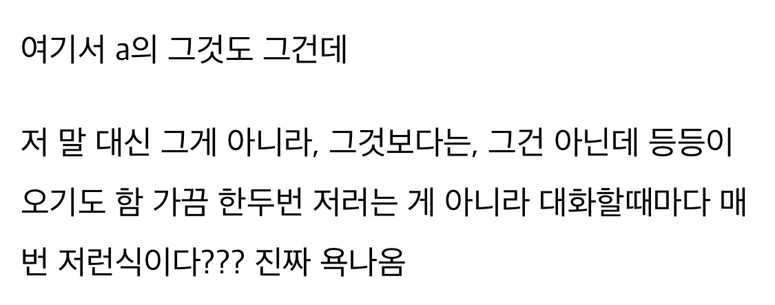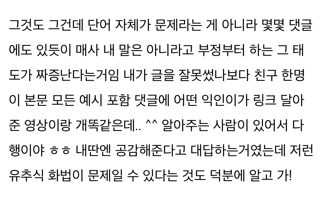 작성자엔트로피 작성시간 24.11.19 뭘표현했는지는 알거걑애.. entp같은사람들이 저렇더라 자기가생각한거명확히 집어주지않으면 저래 스타일차이
