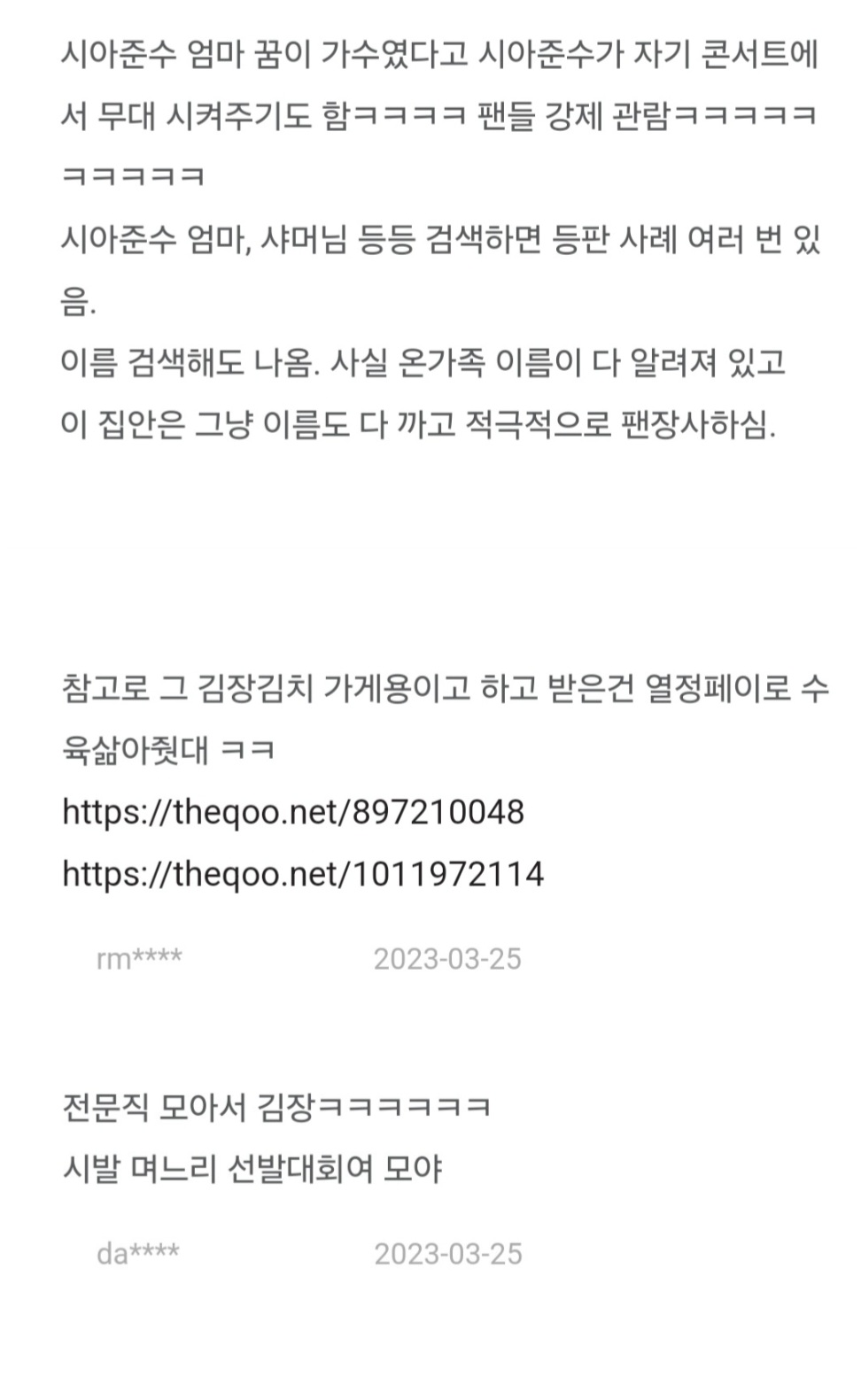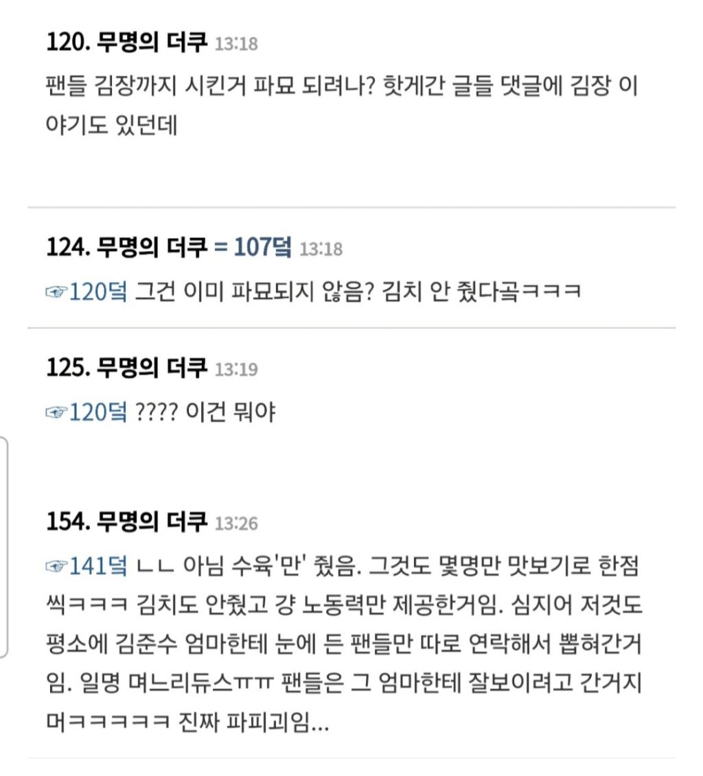 출처: 더쿠 - 아이돌 엄마가 전문직 팬뽑아다가 김장시키고 김치안줌 일명 며느리듀스
