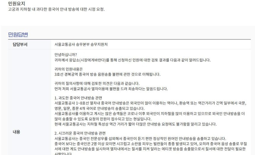 18일 서울시 응답소 홈페이지에 따르면 서울교통공사 승무본부 승무지원처는 '고궁과 지하철 내 과다한 중국어 안내 방송에 대한 시정 요청'에 관한 민원에 답변하면서 중국인을 깎아내리는 표현을 사용했다.