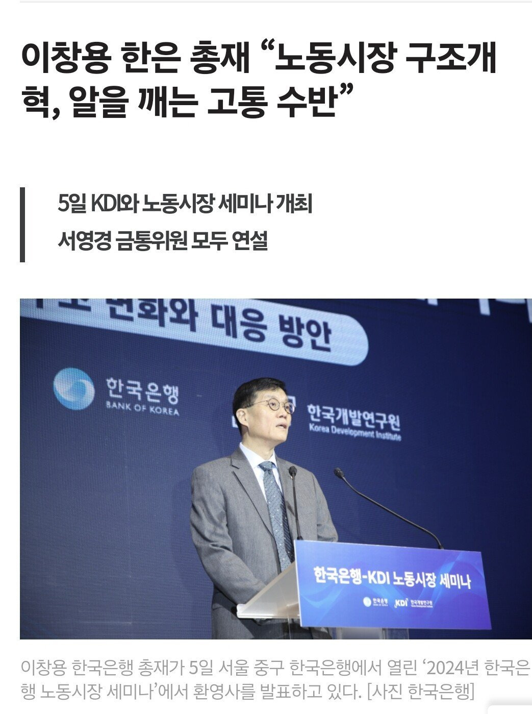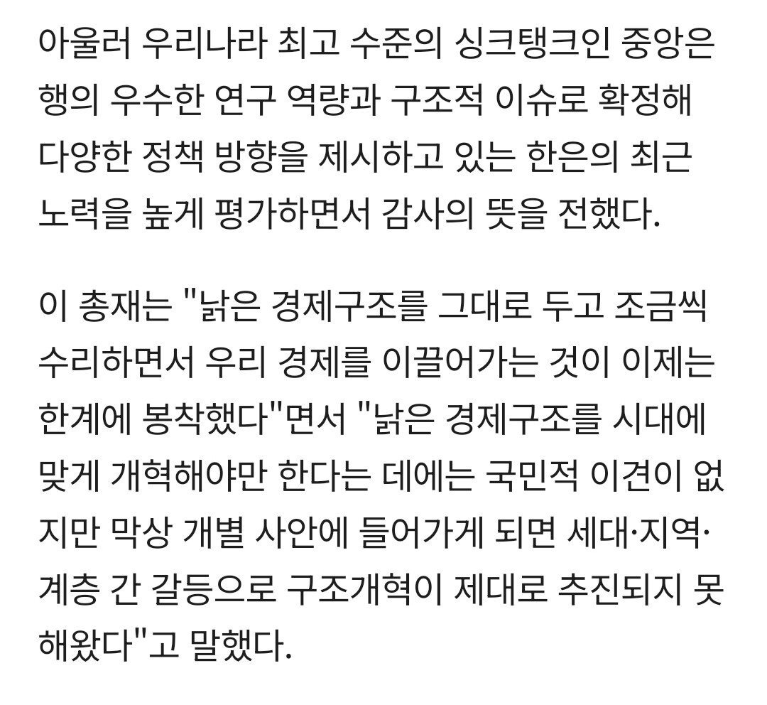 [ 더 이상 경제구조의 점진적 개선 정도로는 발전할수 없고, 이에 동의하는 사람조차 이해관계 때문에 구조개혁을 적극 지원하지 않는다는 한국은행 총재 ]
