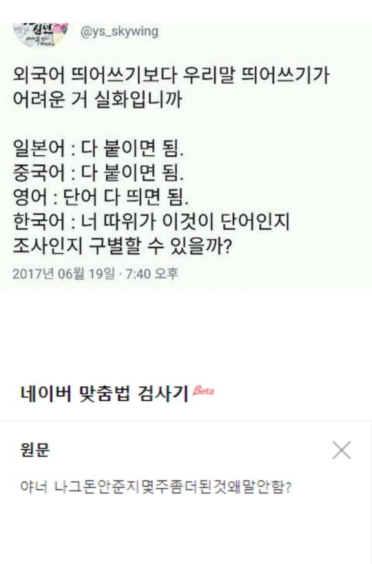 [스크랩] [흥미돋]나라별 띄어쓰기 특징 작성자올웨이z|작성시간24.11.20|조회수7,177 목록 댓글 4 글자크기 작게가 글자크기 크게가 다음검색 스크랩 원문 : 쭉빵카페 현재 게시글 추가 기능 열기 북마크 공유하기 신고 센터로 신고 댓글 댓글 4 댓글쓰기 답글쓰기 댓글 리스트 작성자Suzy | 작성시간 24.11.20 공문서는 맞춤법 맞게 띄어쓰면 또 붙이는게 이쁘다고 붙여버리기도함 ㅡ.ㅡ 작성자불안초조조급증 | 작성시간 24.11.20 띄어 띄어 작성자야돈 | 작성시간 24.11.20 아 미친 그러네 ㅋㅋㅋㅋㅋㅋ 나도 헷갈리는거 많아서 보고서나 자료에 쓰는거는 띄어쓰기 검사 꼭 돌려봄ㅋㅋ 작성자성실이 | 작성시간 24.11.20 ㅋㅋㅋㅋ 댓글 전체보기