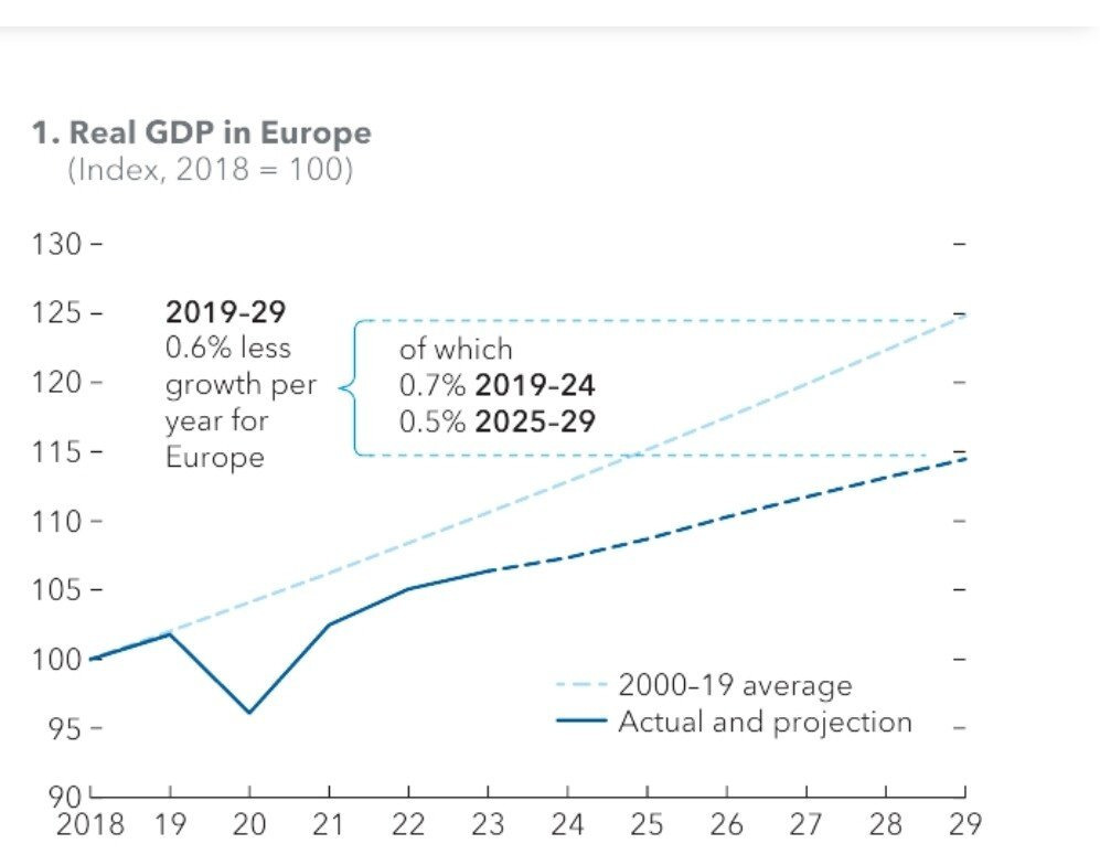 [ 지난 5년간 유럽 경제 성장률이 2000-2019년 평균 성장률 0.7% 낮다는 IMF 발표 ]