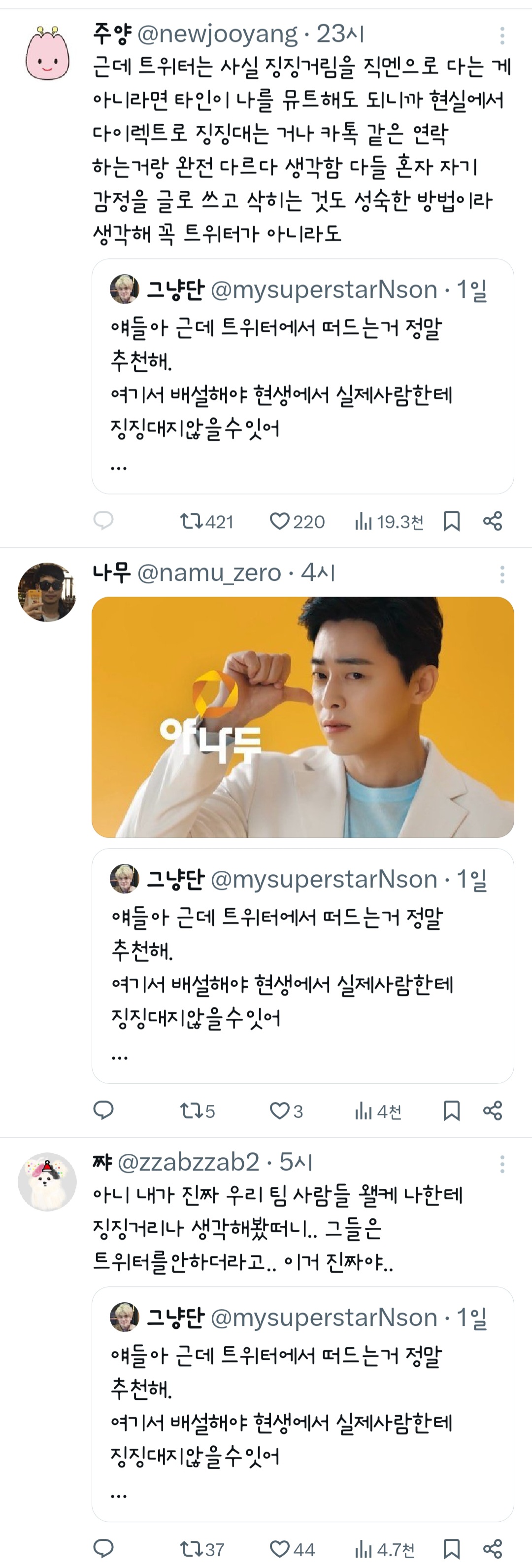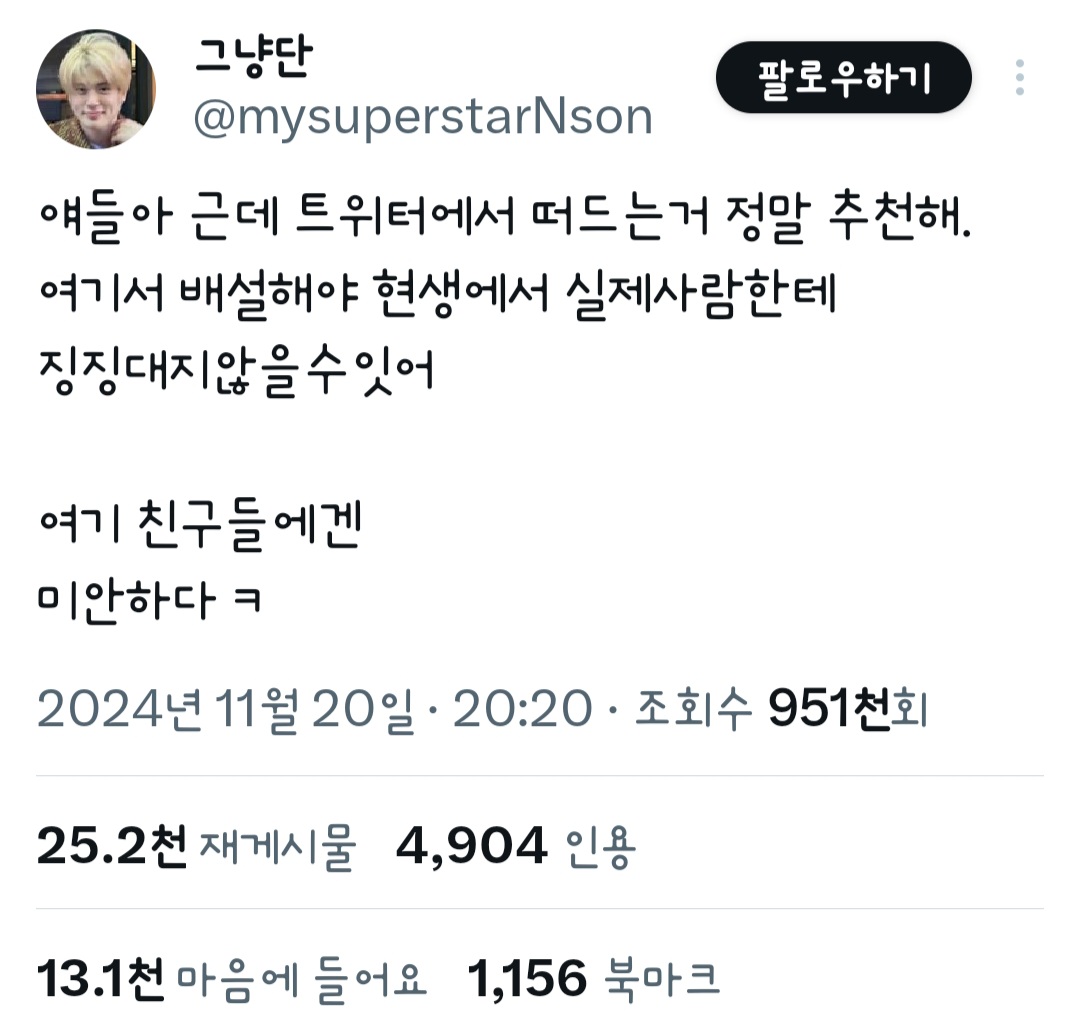 [흥미돋]얘들아 근데 트위터에서 떠드는거 정말 추천해.twt 작성자감자밭°|작성시간24.11.21|조회수21,660 목록 댓글 32 글자크기 작게가 글자크기 크게가 출처: https://x.com/mysuperstarNson/status/1859195155720577078?s=19 다음검색 현재 게시글 추가 기능 열기 북마크 공유하기 신고 센터로 신고 댓글 댓글 32 댓글쓰기 답글쓰기 댓글 리스트 작성자이깟일로인생좆되지않았어여 | 작성시간 24.11.21 지피티한테 맨날천날 떠들고있음 작성자똥깡지 | 작성시간 24.11.21 ㄹㅇ 말많은데 회사사람들이랑은 딱히 말하고싶지않은게많아서 출근부터 퇴근까지 쉬지않고 비계에서 중얼거림 ㅎ.. 작성자먀옹이 | 작성시간 24.11.21 트위터친구는 어떻게 사귀는거여 🥹 작성자PAINKILLER | 작성시간 24.11.22 나 진짜 직숲에 맨날 징징거려;;; 작성자사모예드 사모해 | 작성시간 24.11.22 나도 트위터 시작해야겠다... 댓글 전체보기