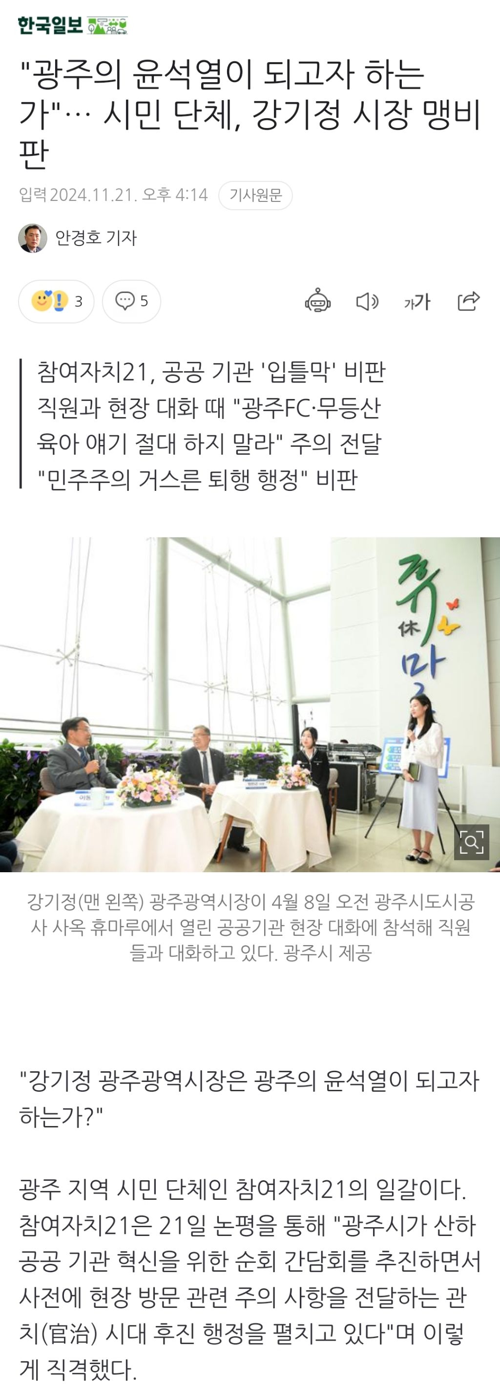 [여시뉴스데스크]"광주의 윤석열이 되고자 하는가"… 시민 단체, 강기정 시장 맹비판 작성자천리길|작성시간24.11.21|조회수808 목록 댓글 3 글자크기 작게가 글자크기 크게가 출처: https://naver.me/59vdaIdm"광주의 윤석열이 되고자 하는가"… 시민 단체, 강기정 시장 맹비판"강기정 광주광역시장은 광주의 윤석열이 되고자 하는가?" 광주 지역 시민 단체인 참여자치21의 일갈이다. 참여자치21은 21일 논평을 통해 "광주시가 산하 공공 기관 혁신을 위한 순회 간담회를 n.news.naver.com이하 생략전문 출처로 다음검색 현재 게시글 추가 기능 열기 북마크 공유하기 신고 센터로 신고 댓글 댓글 3 댓글쓰기 답글쓰기 댓글 리스트 작성자김치값때문에김밥에김치가실종 | 작성시간 24.11.21 왜 하지말라는거지 관광이나 교육 복지쪽에 문외한인가 작성자타이거즈곽도규 | 작성시간 24.11.21 강기정 진짜 ㅡㅡ 너 뽑기싫어서 그때 광주 지방선거 투표율 몇퍼였는지 기억안나지? 작성자젠틀움 | 작성시간 24.11.21 오늘 넥타이 언급해주길바라는거? 댓글 전체보기