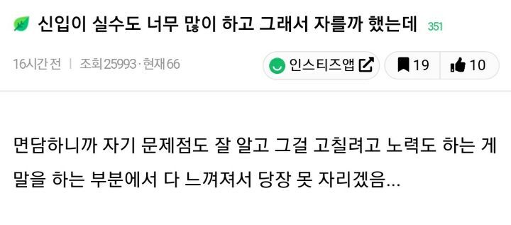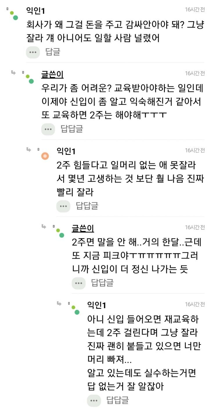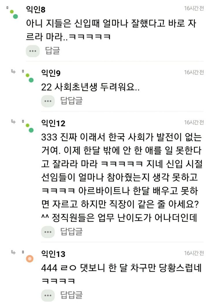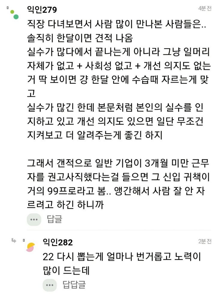 작성자rowlfkf 작성시간 24.11.22 차라리 제발 잘라라 그신입이 느그회사에 있기 아까움