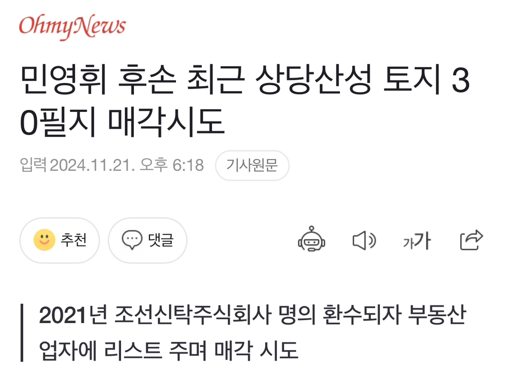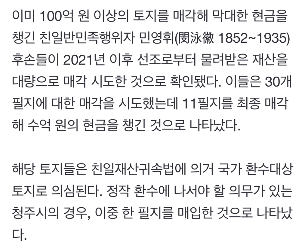 [여시뉴스데스크]친일반민족행위자 민영휘 후손 최근 상당산성 토지 30필지 매각시도 작성자소리앙|작성시간24.11.21|조회수1,022 목록 댓글 7 글자크기 작게가 글자크기 크게가 출처: https://naver.me/xIeko28N민영휘 후손 최근 상당산성 토지 30필지 매각시도▲ 민영휘 후손이 청주 한 부동산 업자에게 매매를 부탁하며 건넨 토지리스트 ⓒ 충북인뉴스 이미 100억 원 이상의 토지를 매각해 막대한 현금을 챙긴 친일반민족행위자 민영휘(閔泳徽 1852~1935) n.news.naver.com전문출처 다음검색 현재 게시글 추가 기능 열기 북마크 공유하기 신고 센터로 신고 댓글 댓글 7 댓글쓰기 답글쓰기 댓글 리스트 작성자종신보험들지마라 | 작성시간 24.11.21 찾아보니까 이렇게 뜨네 와우...... 이미지 확대 작성자웃으며 안녕 | 작성시간 24.11.21 환수해 작성자다조빱으로보여요 | 작성시간 24.11.21 세상이 미쳐돌아가 작성자후훟후 | 작성시간 24.11.21 내놔 작성자반일을 외치며 이득을 취하는 여시 | 작성시간 24.11.22 다 내놓고 뒤져라 댓글 전체보기