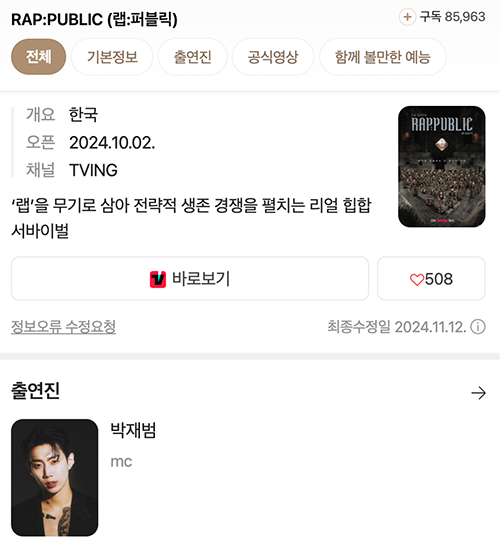 랩:퍼블릭 검색하면 출연진에 유일하게 등록된 MC 박재범