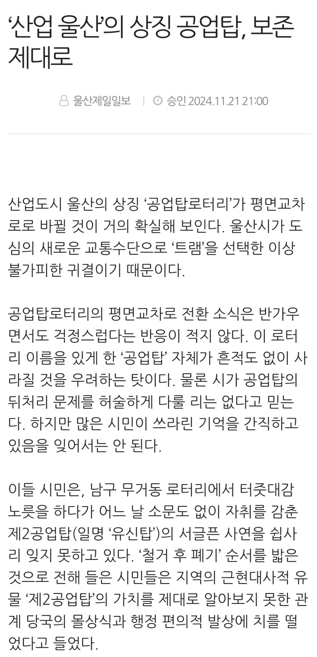 [여시뉴스데스크]‘산업 울산’의 상징 공업탑, 보존 제대로 작성자천리길|작성시간24.11.21|조회수801 목록 댓글 2 글자크기 작게가 글자크기 크게가 출처: http://www.ujeil.com/news/articleView.html?idxno=357800‘산업 울산’의 상징 공업탑, 보존 제대로 - 울산제일일보산업도시 울산의 상징 ‘공업탑로터리’가 평면교차로로 바뀔 것이 거의 확실해 보인다. 울산시가 도심의 새로운 교통수단으로 ‘트램’을 선택한 이상 불가피한 귀결이기 때문이다.공업탑로www.ujeil.com이하 생략전문 출처로 다음검색 현재 게시글 추가 기능 열기 북마크 공유하기 신고 센터로 신고 댓글 댓글 2 댓글쓰기 답글쓰기 댓글 리스트 작성자꽇부닁 | 작성시간 24.11.21 헐 트램 걍 공업탑 밑에 구멍뚫어ㅠ 작성자나는엣팁이다 | 작성시간 24.11.22 왜!!!!!!!!!!!!!!!!!!공업탑냅둬! 댓글 전체보기