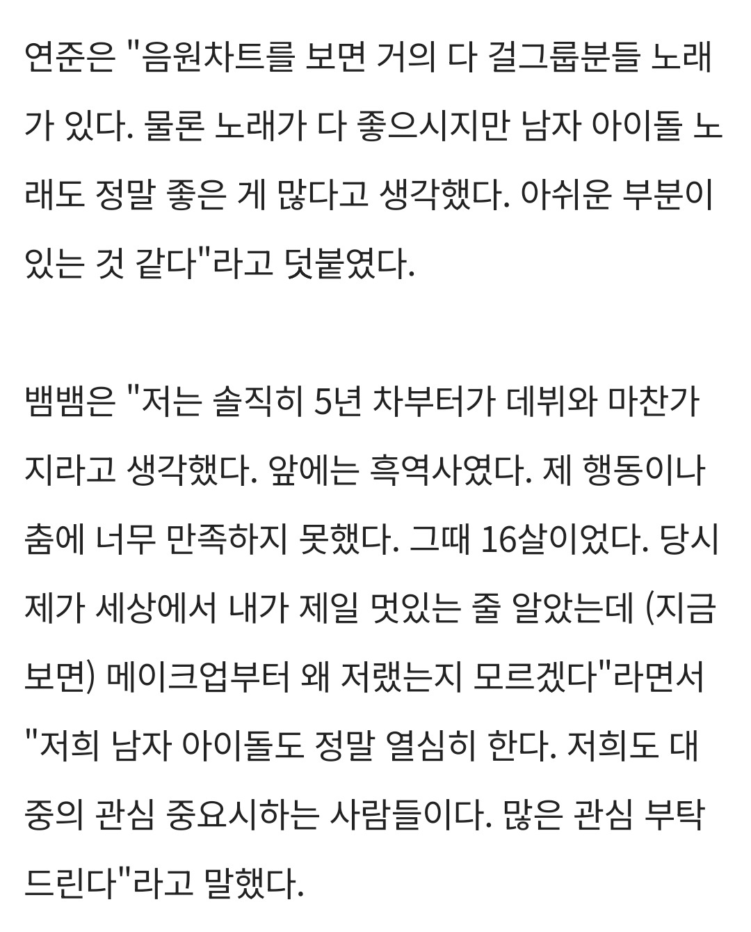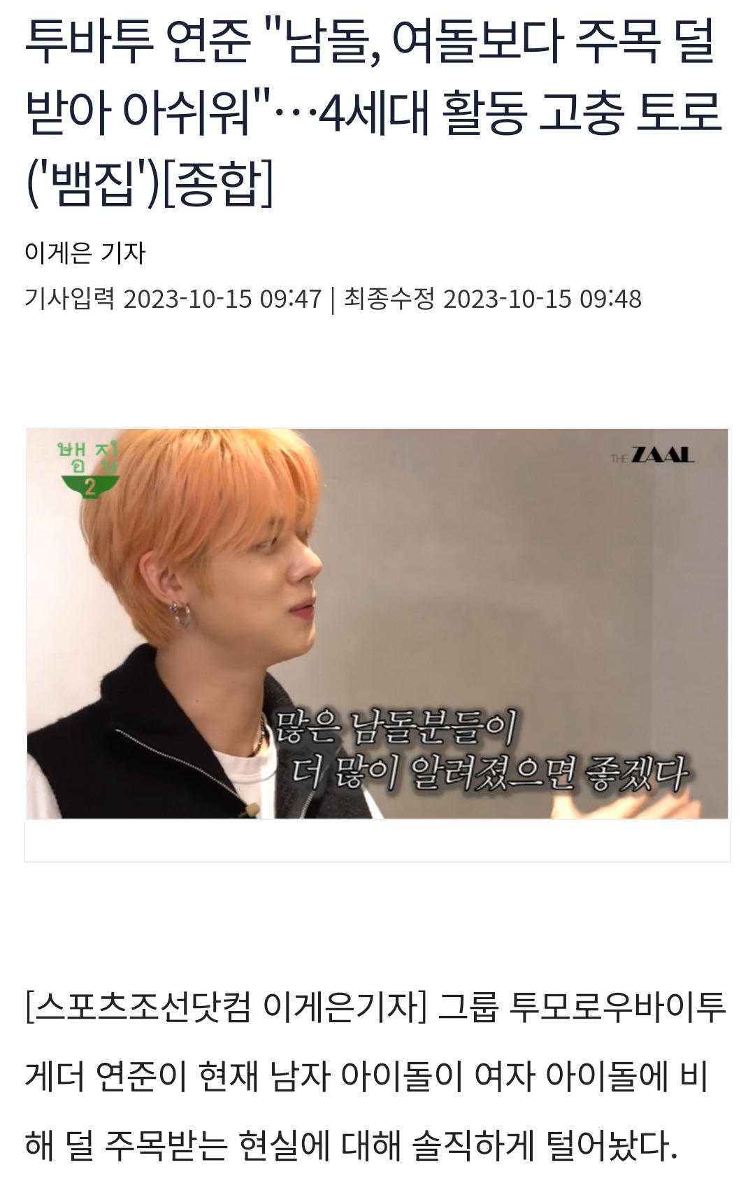 [스크랩] [여시뉴스데스크]투바투 연준 "남돌, 여돌보다 주목 덜 받아 아쉬워"…4세대 활동 고충 토로 ('뱀집')[종합] 작성자모아나모|작성시간24.11.23|조회수7,009 목록 댓글 121 글자크기 작게가 글자크기 크게가 출처: https://sports.chosun.com/news/ntype.htm?id=202310160100092480013698&servicedate=20231015투바투 연준 "남돌, 여돌보다 주목 덜 받아 아쉬워"…4세대 활동 고충 …그룹 투모로우바이투게더 연준이 현재 남자 아이돌이 여자 아이돌에 비해 덜 주목받는 현실에 대해 솔직하게 털어놨다.지난 14일 웹 예능 '뱀집…sports.chosun.com 다음검색 스크랩 원문 : *여성시대* 차분한 20대들의 알흠다운 공간 현재 게시글 추가 기능 열기 북마크 공유하기 신고 센터로 신고 댓글 댓글 121 댓글쓰기 답글쓰기 댓글 리스트 작성자너를 닮은 사람 | 작성시간 24.11.24 주목을 왜 덜 받겠어요ㅋㅋㅋㅋㅋㅋㅋ 작성자쫀득버블티 | 작성시간 24.11.24 시혀기한테 큰사랑 받고있음 됐지 풉킥 작성자내인생잘될게뻔해 | 작성시간 24.11.24 왤까요 작성자tehfkya | 작성시간 24.11.24 엥 왜겠노 작성자잉치킨 | 작성시간 24.11.25 실력,인성,노력,외모,끼뭐 하나 걸그룹보다 나은게 없는데대중들이 왜 관심가지겠냐?ㅋㅋㅋㅋ 댓글 전체보기