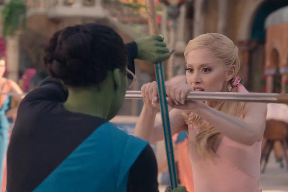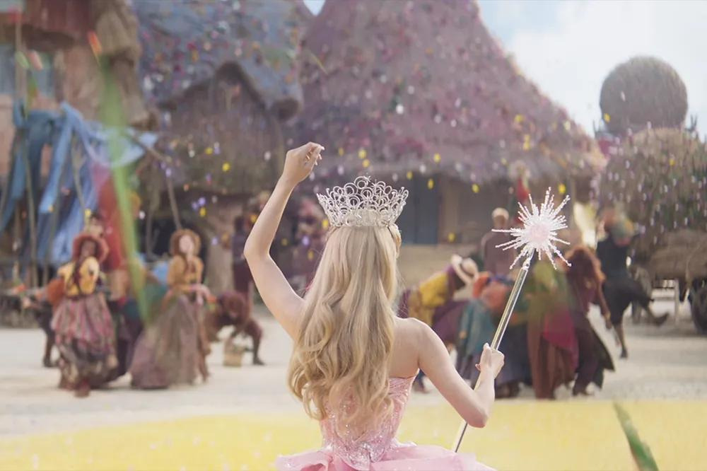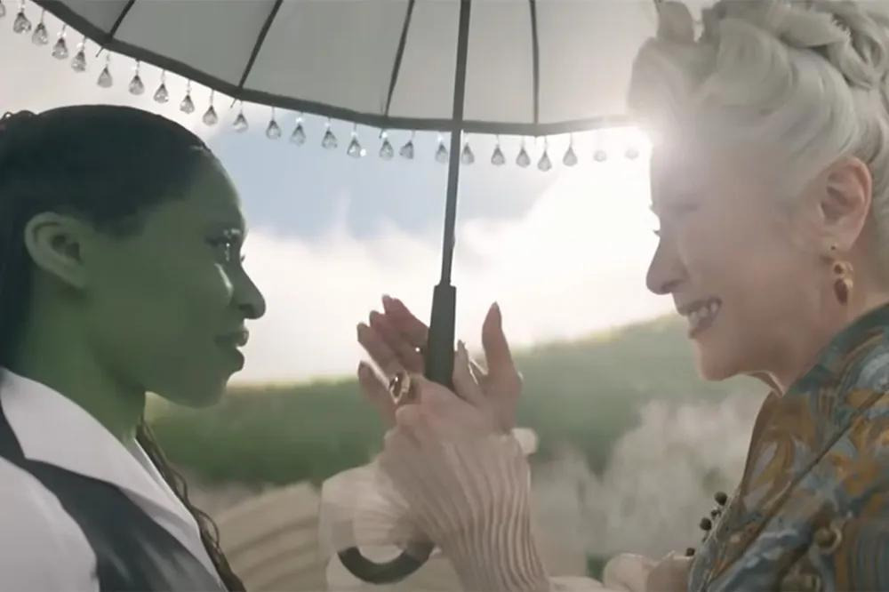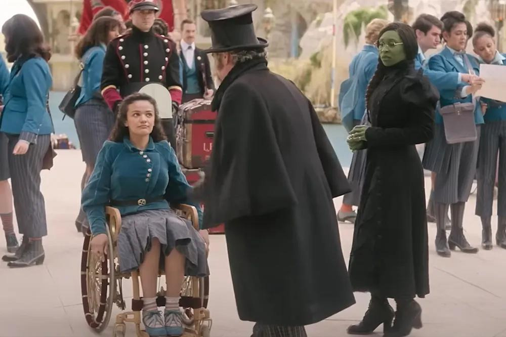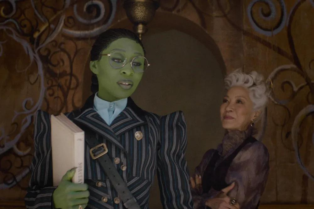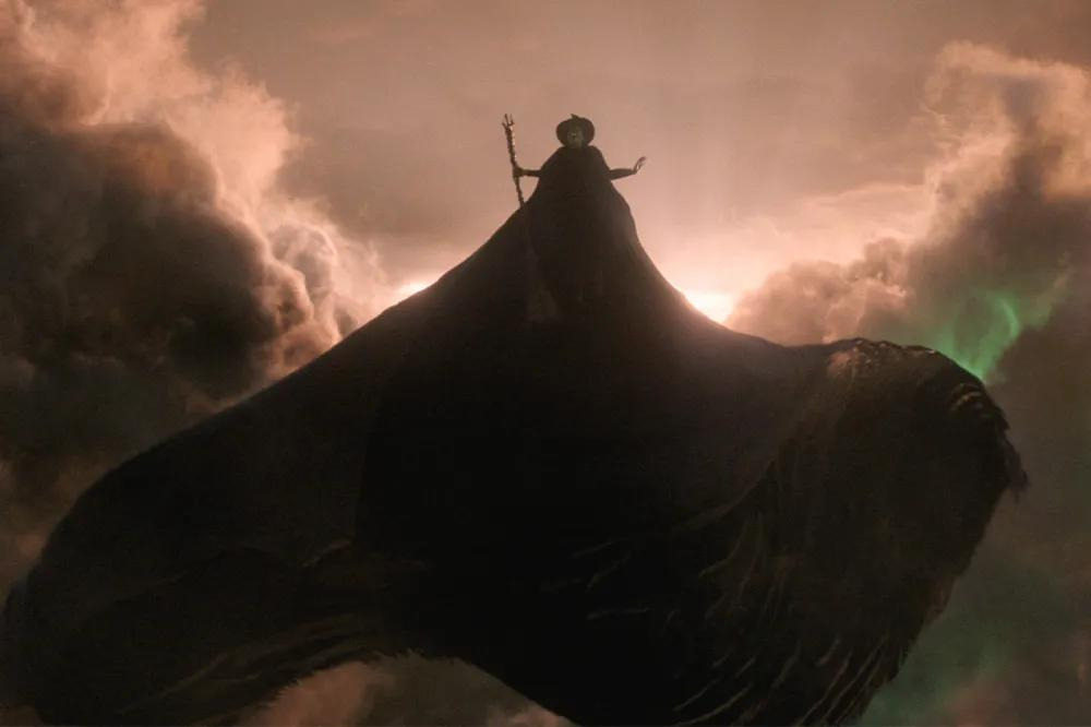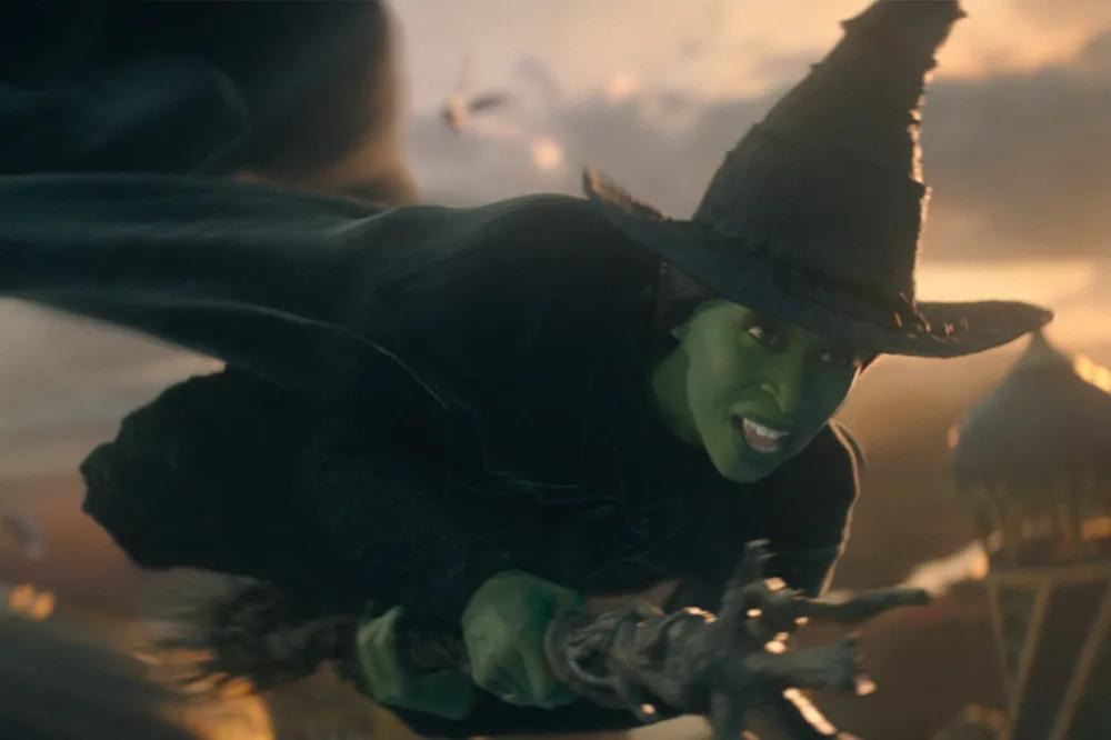 원작 뮤지컬 팬이라면 ‘Defying Gravity’ 노래 장면에서 엘파바가 빗자루를 타고 공중으로 날아오를 때, 검은 망토가 무대 전체에 펼쳐지는 상징적인 순간을 기억할 것이다. 영화에서도 신시아 에리보가 비슷한 포즈를 취하고, 오즈의 경비병들 위로 높이 날아오를 때 망토의 검은 천이 스크린을 가득 채우는 것을 통해 그 장면을 오마주한다.