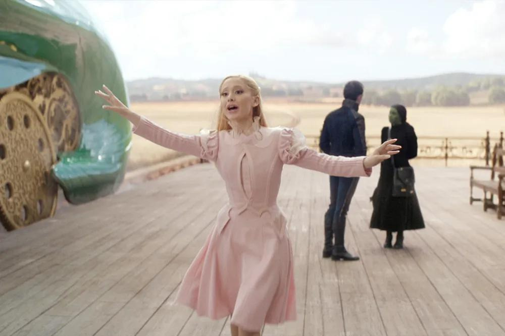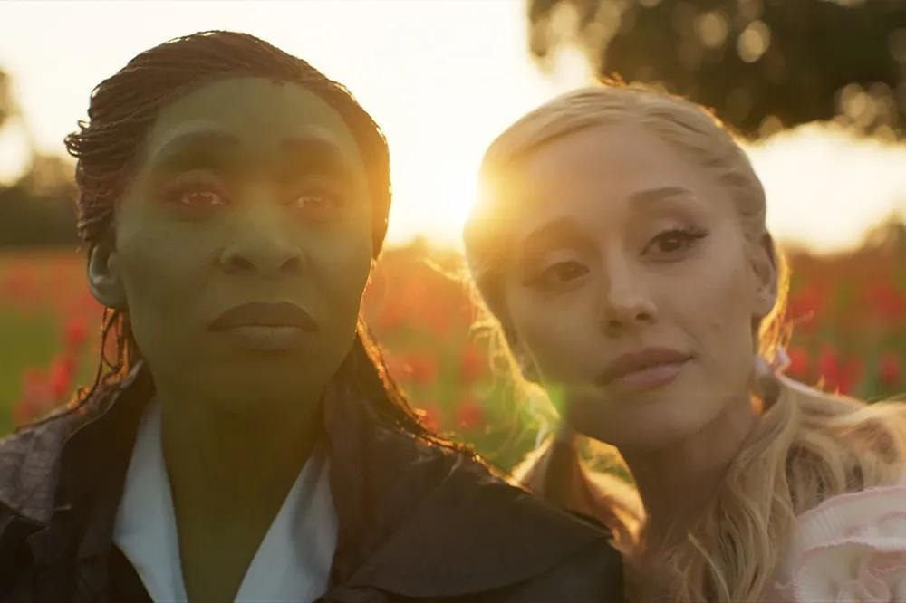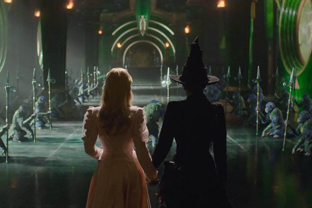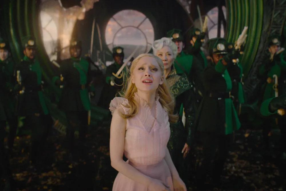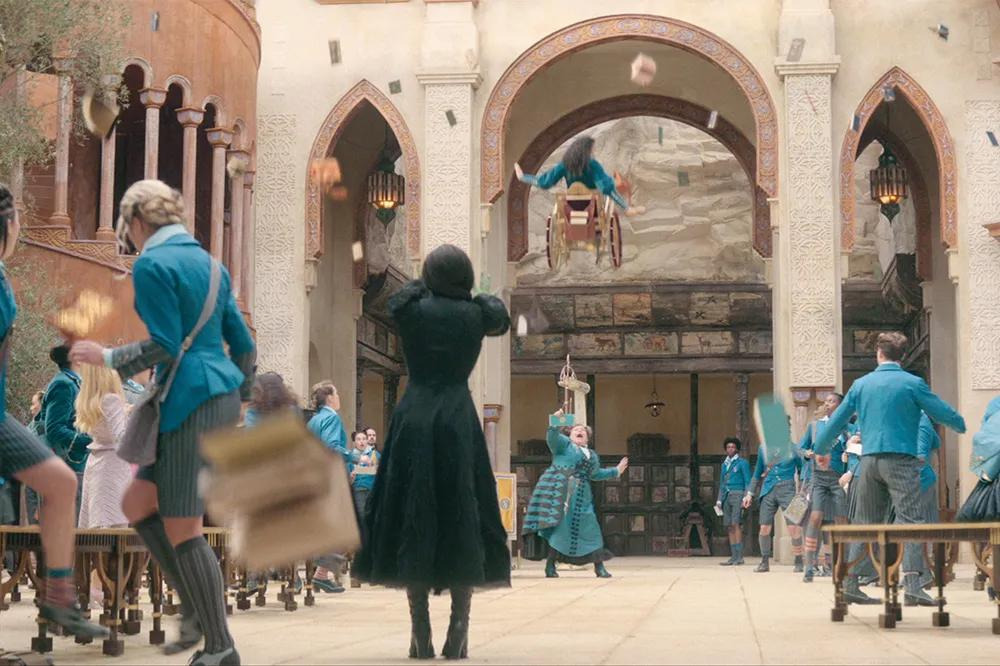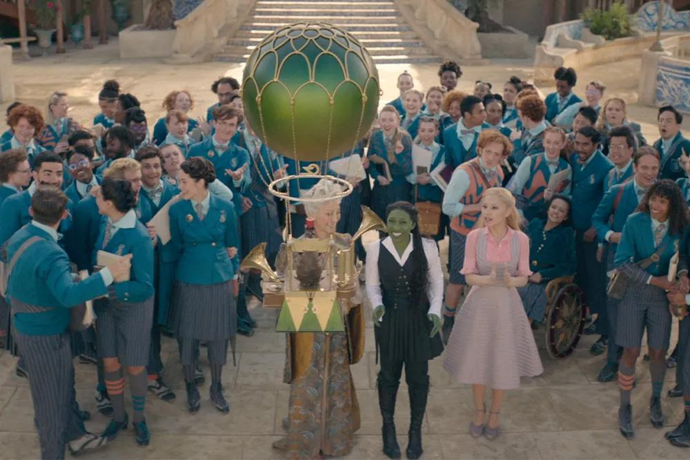 원작 뮤지컬 팬이라면 ‘Defying Gravity’ 노래 장면에서 엘파바가 빗자루를 타고 공중으로 날아오를 때, 검은 망토가 무대 전체에 펼쳐지는 상징적인 순간을 기억할 것이다. 영화에서도 신시아 에리보가 비슷한 포즈를 취하고, 오즈의 경비병들 위로 높이 날아오를 때 망토의 검은 천이 스크린을 가득 채우는 것을 통해 그 장면을 오마주한다.