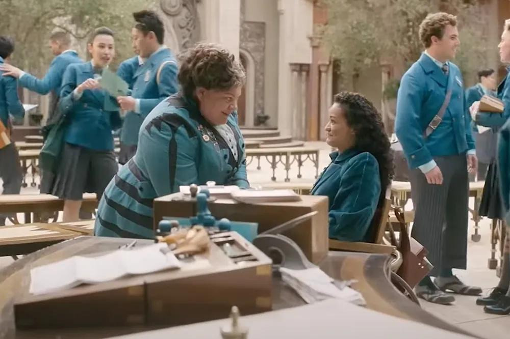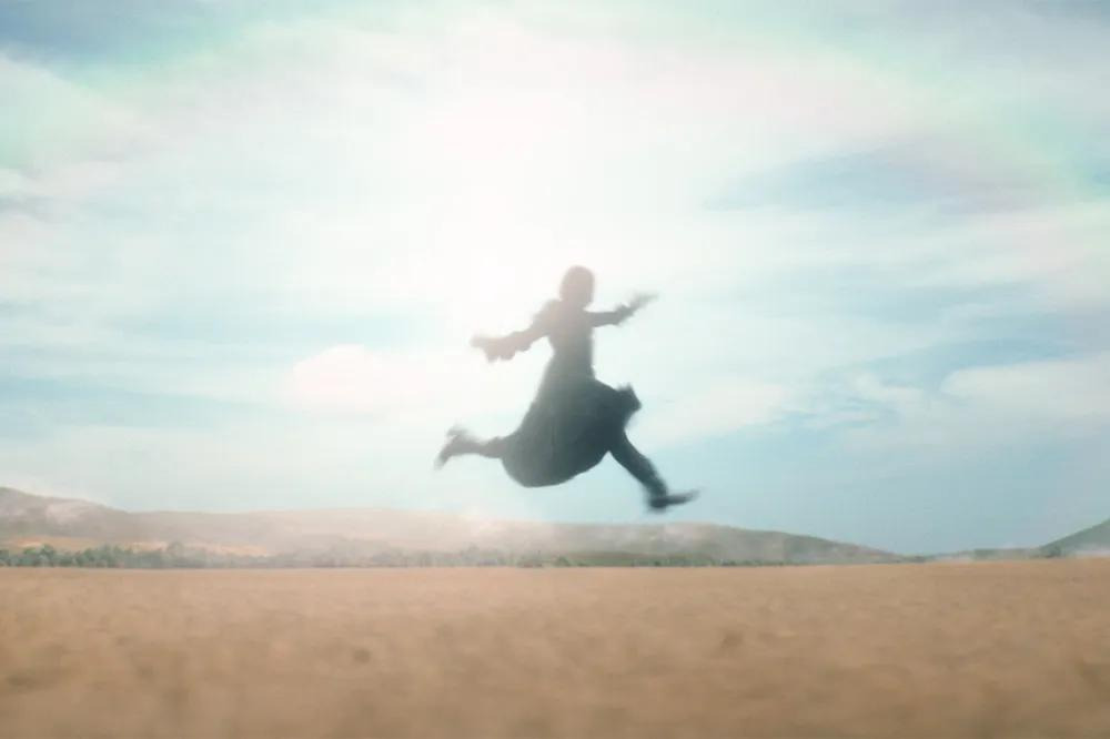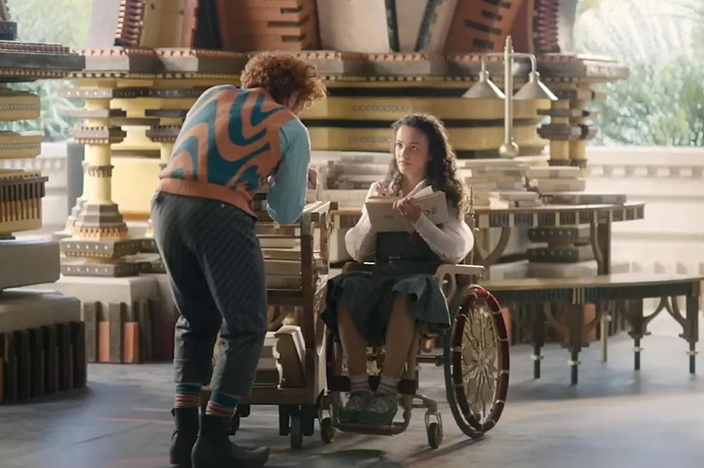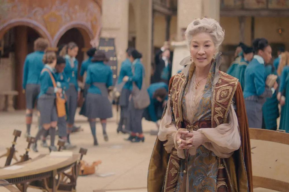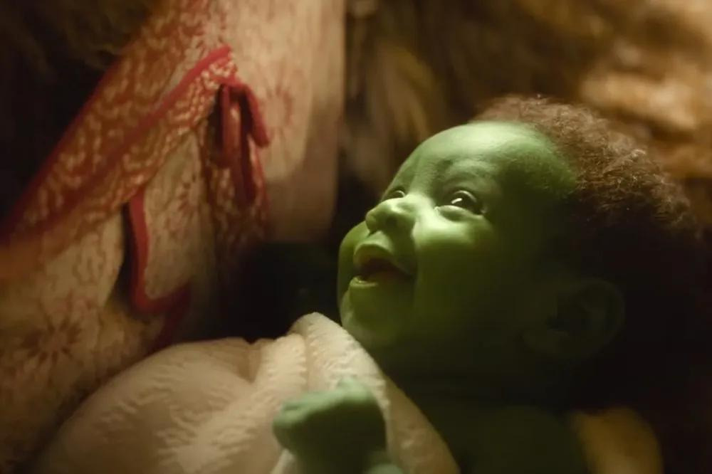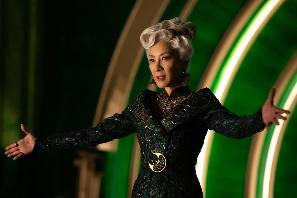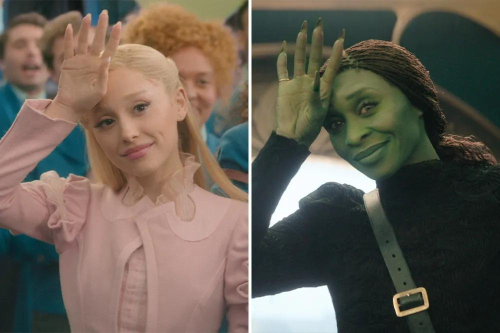 원작 뮤지컬 팬이라면 ‘Defying Gravity’ 노래 장면에서 엘파바가 빗자루를 타고 공중으로 날아오를 때, 검은 망토가 무대 전체에 펼쳐지는 상징적인 순간을 기억할 것이다. 영화에서도 신시아 에리보가 비슷한 포즈를 취하고, 오즈의 경비병들 위로 높이 날아오를 때 망토의 검은 천이 스크린을 가득 채우는 것을 통해 그 장면을 오마주한다.