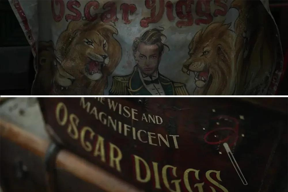 마법사가 오즈에 오기 전, 오스카 딕스라는 이름의 마술사로 활동하던 시절 그를 홍보하는 포스터와 마술 공연에 사용한 트렁크들이 에메랄드 시티 궁전의 다락방에 놓여있다.
