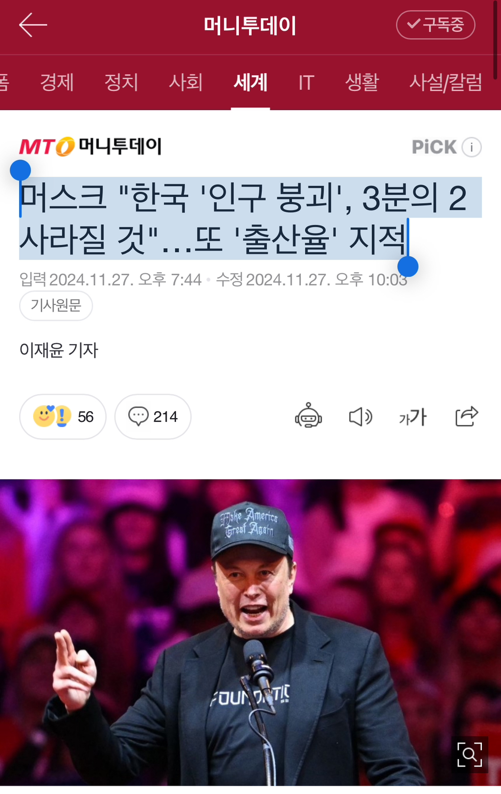 머스크는 2022년에도 트위터에 월스트리트저널(WSJ) 기사를 인용하면서 "한국이 홍콩과 함께 세계에서 가장 빠른 인구 붕괴를 겪고 있다"고 언급했다.
