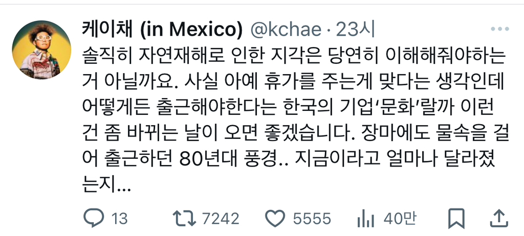 작성자모해모햇 작성시간 24.11.29 항공 지연 결항도 자연재해 때는 보상 안 해주는데 우리도 자연재해 때는 재택해도 되는 거 아닌가요ㅜ