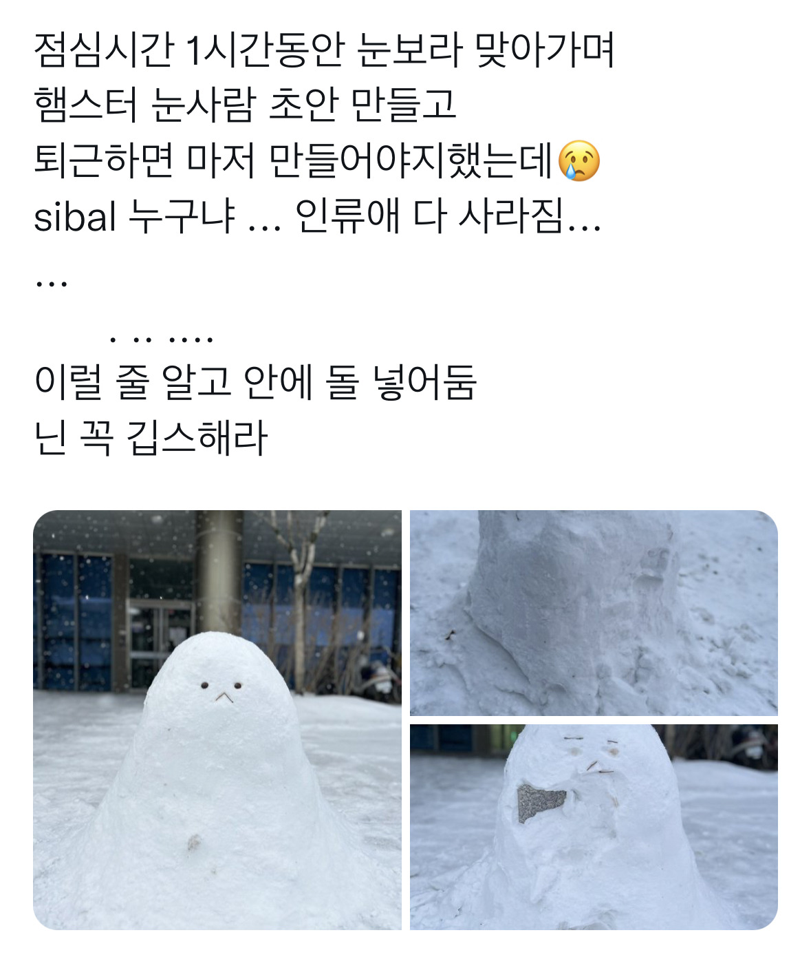 [흥미돋]눈사람 만들기가 무서운 이유.gif 작성자운석열 미쳤음|작성시간24.11.30|조회수13,109 목록 댓글 47 글자크기 작게가 글자크기 크게가 출처: https://m.cafe.daum.net/subdued20club/ReHf/3079736?svc=cafeapp대형눈사람 만드시는 분들.... 볼라드 위에 만드세요 강추... 😊 다음검색 현재 게시글 추가 기능 열기 북마크 공유하기 신고 센터로 신고 댓글 댓글 47 댓글쓰기 답글쓰기 댓글 리스트 작성자기름인간 | 작성시간 24.11.30 움짤 진짜 ㅎㅌㅊ같다 ㅋㅋㅋㅋ 저 가녀린 다리 작성자그저누워있는 | 작성시간 24.11.30 꼬시다ㅋㅋㅋㅋㄱㄱㄱㅋㄱㄱㅋㄱㅋ새끼 발톱 날아갔음 좋겠당 작성자시원쌀쌀 | 작성시간 24.11.30 남혐생성기들ㅉㅉ 작성자침대핑 | 작성시간 24.12.01 제발 돌넣고.. 만들어서 다리부러진 한남짤 보는게 소원.. 작성자고양이가 뿌셔뿌셔 | 작성시간 24.12.01 소금물 부으면 ㄹㅇ돌된대 !! 소금물 생수병에 담아서 궈궈 댓글 전체보기