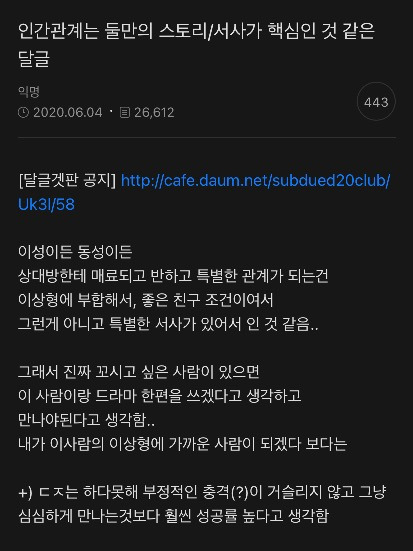 [흥미돋]인간관계는 둘만의 스토리/서사가 핵심인 것 같은 달글 작성자Kamil|작성시간24.12.02|조회수14,919 목록 댓글 56 글자크기 작게가 글자크기 크게가 출처: 여성시대 https://m.cafe.daum.net/subdued20club/VrYr/595261모든 이야기의 시작 - Daum 카페모든 이야기의 시작, Daum 카페m.cafe.daum.net 다음검색 현재 게시글 추가 기능 열기 북마크 공유하기 신고 센터로 신고 댓글 댓글 56 댓글쓰기 답글쓰기 댓글 리스트 답댓글 작성자정정당당둥둥 | 작성시간 24.12.03 서사를 놓지못하고 억지로 끌고가다가 악연으로 끝나는데 그 배드엔딩조차도 강렬해서 본능적으로 다음에는 피하려하는거같더라+ 이번에는 꼭 안정적인 엔딩을 보고싶다는 갈망 작성자샐러즈파슷하 | 작성시간 24.12.03 공감돼 작성자육즙쉬혁 | 작성시간 24.12.03 ㅁㅈ 작성자가을아얼른오렴 | 작성시간 24.12.03 우와 흥미롭다ㅋㅋㅋㅋ 작성자홍차코코아 | 작성시간 24.12.03 그치 그래서 신천지가 그런방면으로 노력하잖아 댓글 전체보기