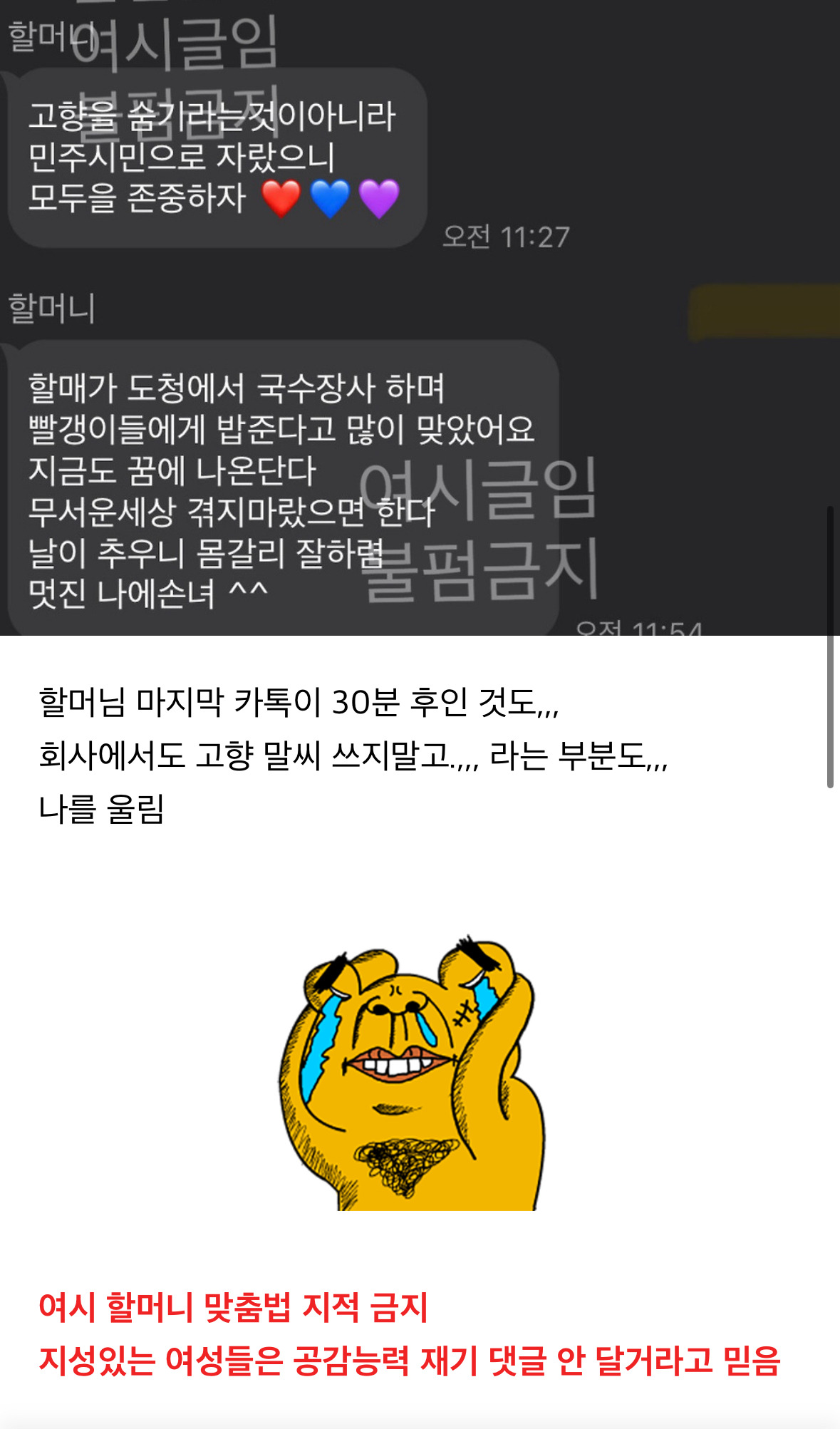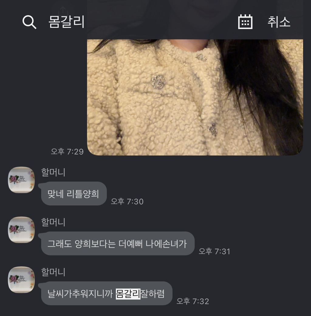 이 글과 할머니의 선택적 맞춤법 틀림(진정되었다, 맞았어요, 겪지 같은 비교적 어려운 맞춤법은 틀리지 않으면서 나에손녀, 마랐으면, 몸갈리 ㅋㅋ 이러시는 할머니가 있다...🤔?)을 근거로 주작 의심 하는 여시들이 나타났고