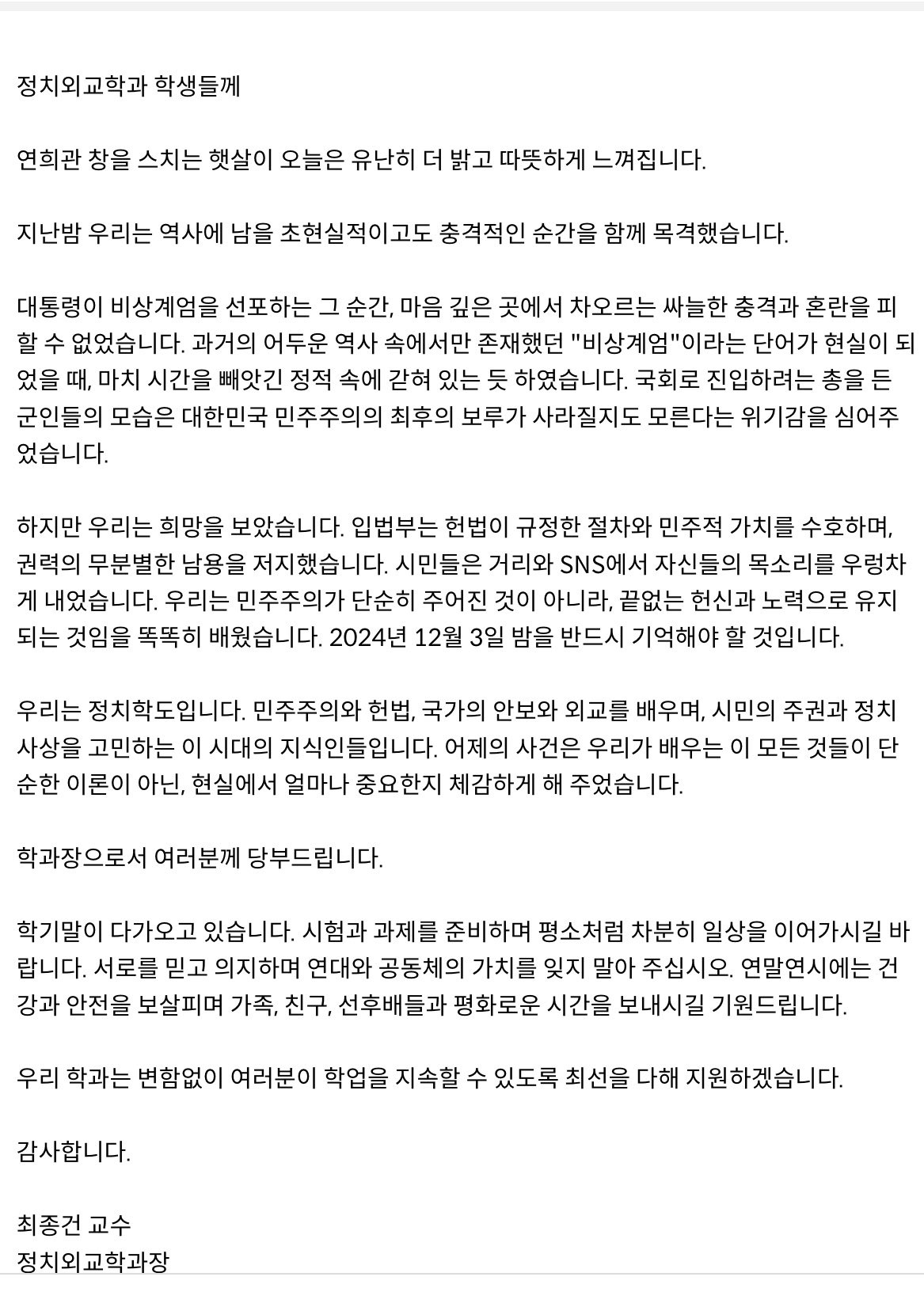 우리는 정치학도입니다. 민주주의와 헌법, 국가의 안보와 외교를 배우며, 시민의 주권과 정치사상을 고민하는 이 시대의 지식인들입니다. 어제의 사건은 우리가 배우는 이 모든 것들이 단순한 이론이 아닌, 현실에서 얼마나 중요한지 체감하게 해 주었습니다.
