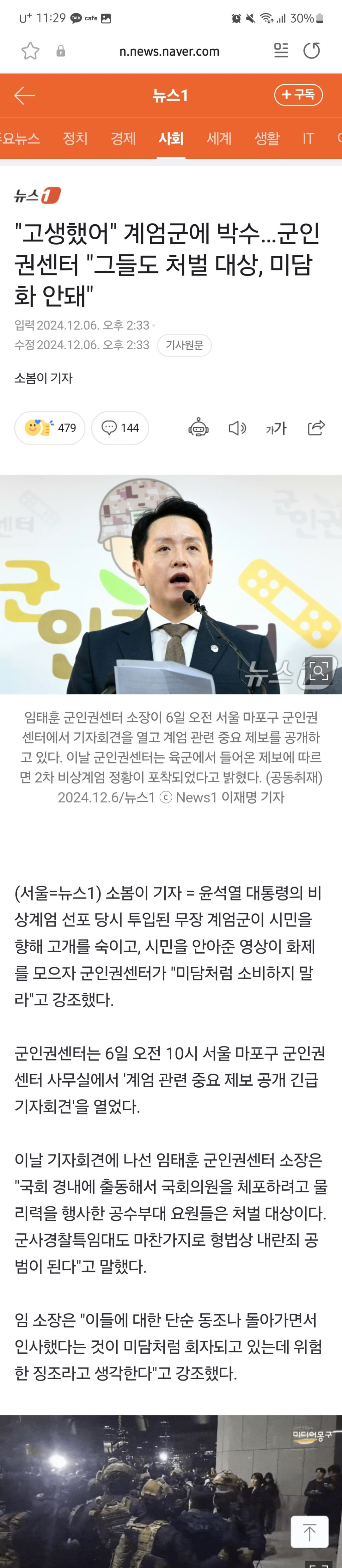 [여시뉴스데스크]"고생했어" 계엄군에 박수…군인권센터 "그들도 처벌 대상, 미담화 안돼" 작성자더덕보끔|작성시간24.12.06|조회수15,580 목록 댓글 213 글자크기 작게가 글자크기 크게가 출처: https://n.news.naver.com/article/421/0007950850?sid=102"고생했어" 계엄군에 박수…군인권센터 "그들도 처벌 대상, 미담화 안돼"윤석열 대통령의 비상계엄 선포 당시 투입된 무장 계엄군이 시민을 향해 고개를 숙이고, 시민을 안아준 영상이 화제를 모으자 군인권센터가 "미담처럼 소비하지 말라"고 강조했다. 군인권센터n.news.naver.com(중략) 다음검색 현재 게시글 추가 기능 열기 북마크 공유하기 신고 센터로 신고 댓글 댓글 213 댓글쓰기 답글쓰기 댓글 리스트 작성자ChetBaker | 작성시간 24.12.07 진짜 .. 개많음 작성자여름열챠 | 작성시간 24.12.07 내란범 작성자부처상 | 작성시간 24.12.07 당연한거를.. 인사 한 번에 아주 좋아죽으면서 빨아주는것들 미개하고 무식하다 하 답답 작성자와이게머야진짜 | 작성시간 24.12.07 고생? 같은 소리하네 작성자출근존나실타 | 작성시간 24.12.07 범죄에 가담했는데 고생?? 댓글 전체보기