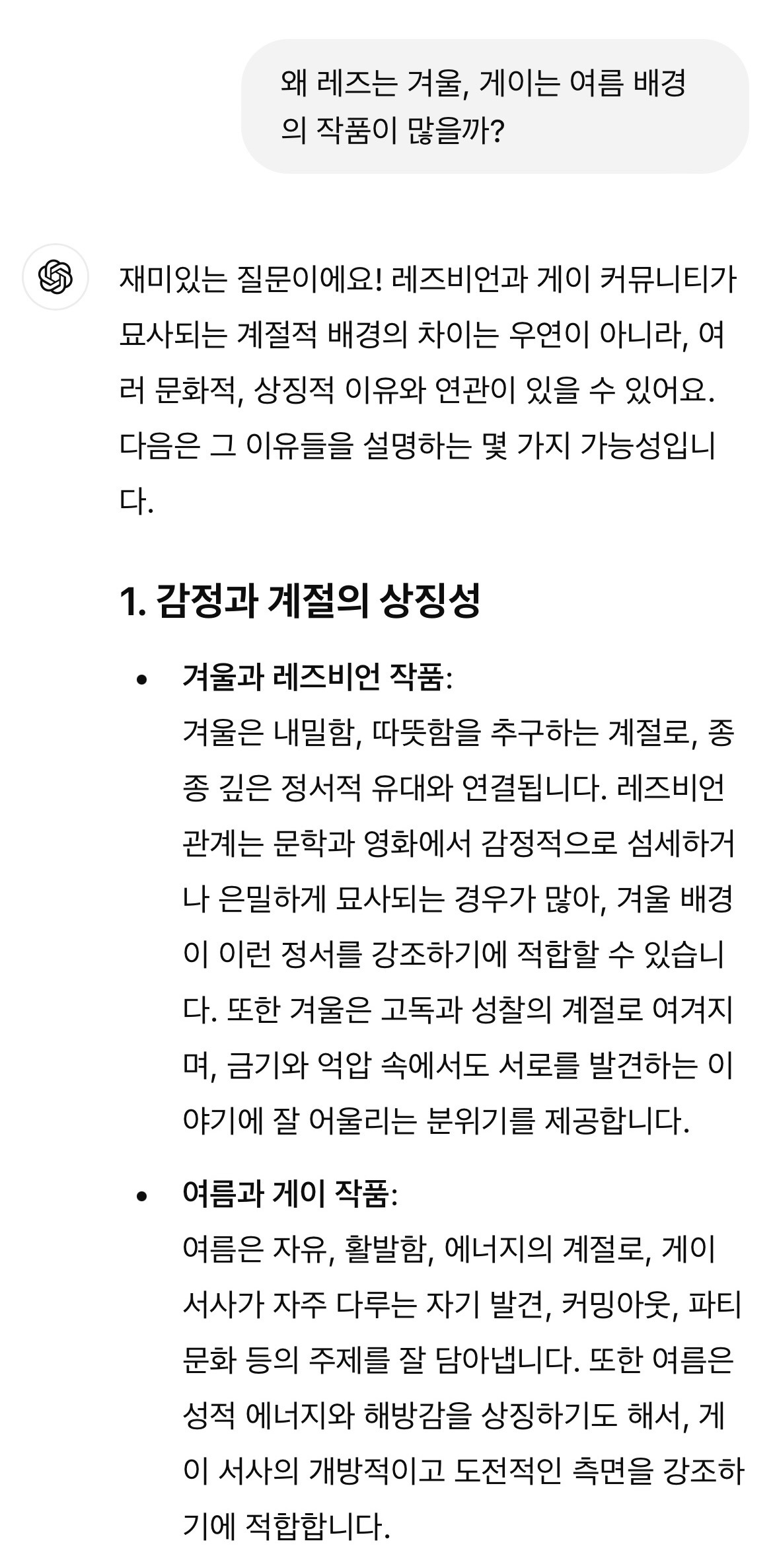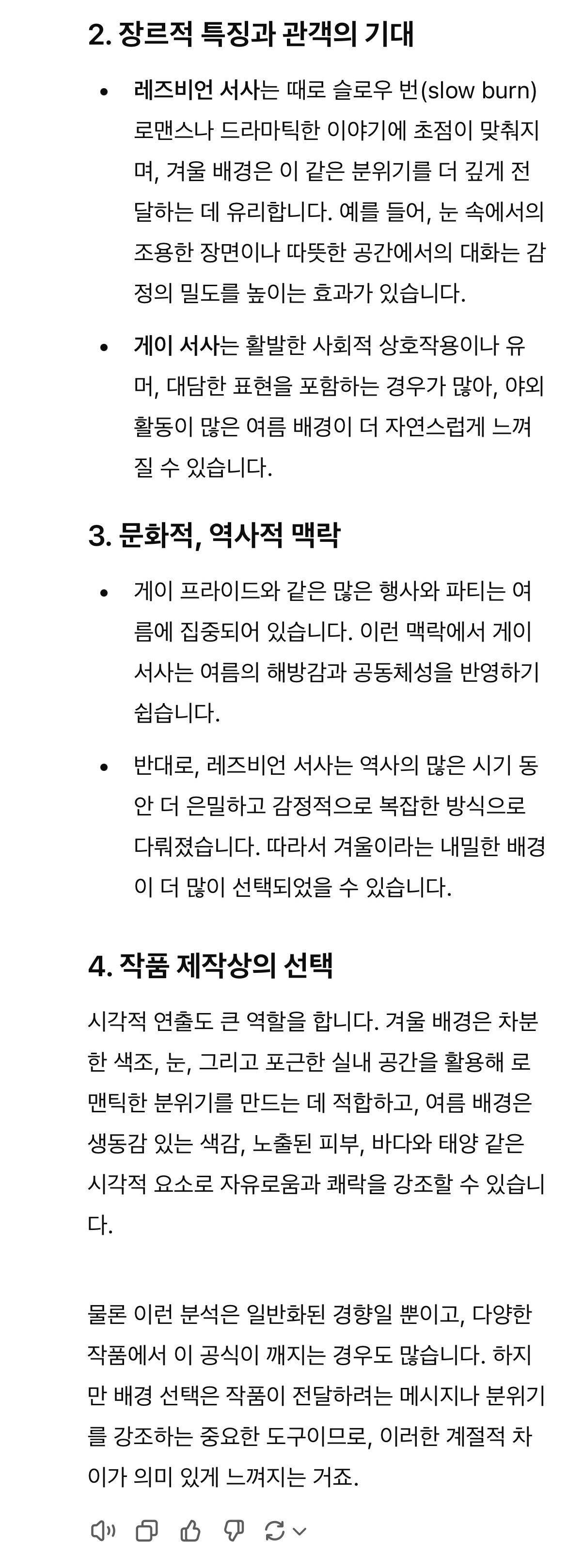 - 반면, 레즈비언 여성은 자신들의 관계를 보호하기 위해 더 은밀하게 행동해야 했고, 이는 서사의 분위기에도 반영되어, 겨울과 같은 차분한 계절적 배경이 선호되었을 가능성이 있습니다.