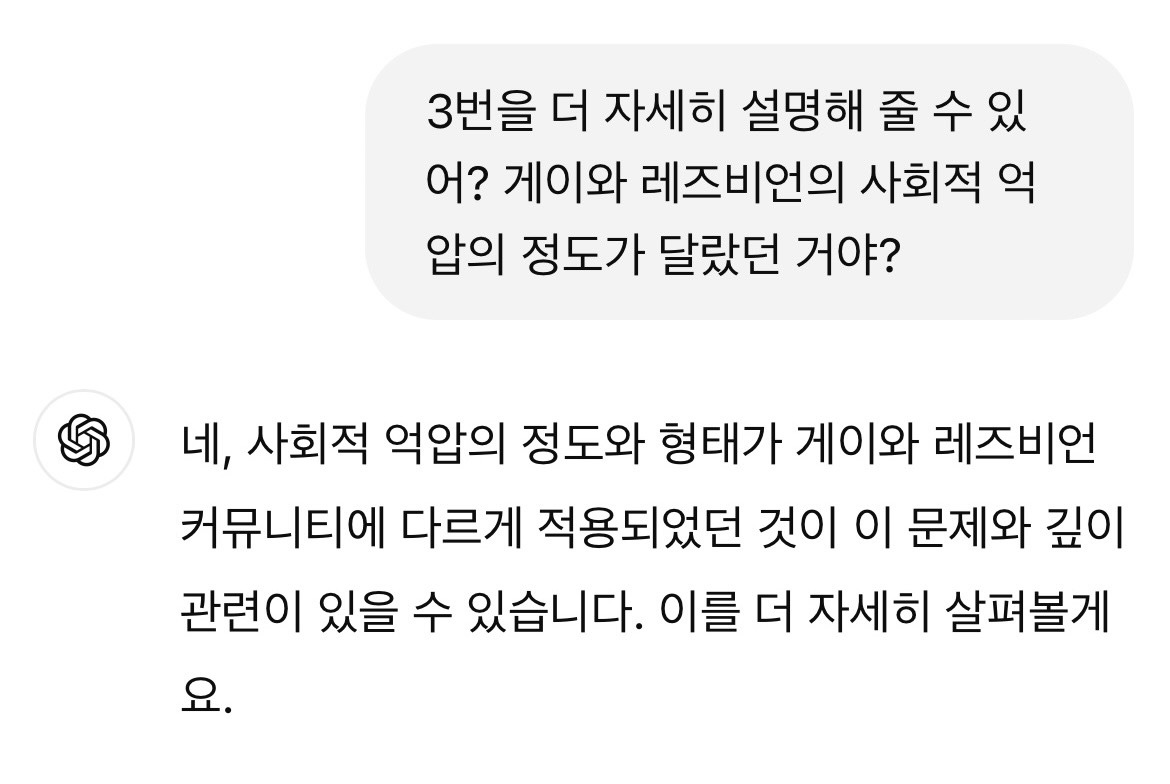 네, 사회적 억압의 정도와 형태가 게이와 레즈비언 커뮤니티에 다르게 적용되었던 것이 이 문제와 깊이 관련이 있을 수 있습니다. 이를 더 자세히 살펴볼게요.
