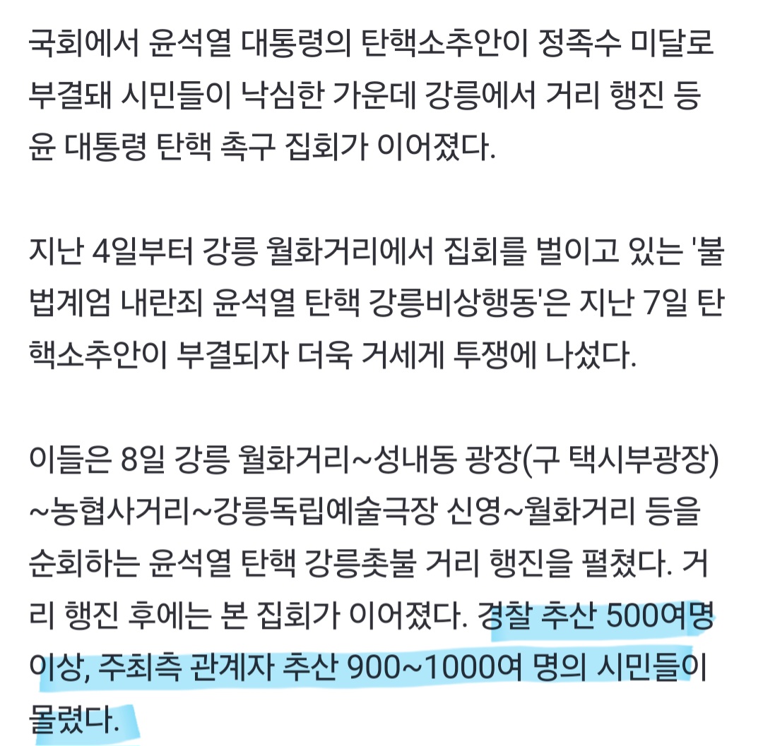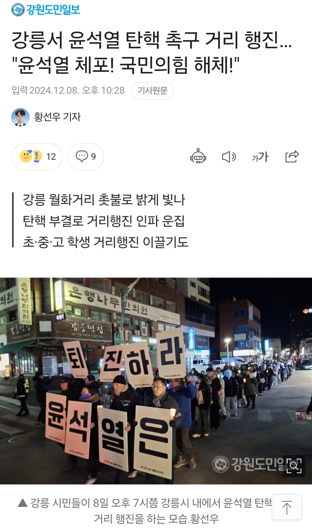 [여시뉴스데스크]강릉서 윤석열 탄핵 촉구 거리 행진… "윤석열 체포! 국민의힘 해체!" 작성자죽을때가되지않았나?|작성시간24.12.08|조회수2,834 목록 댓글 13 글자크기 작게가 글자크기 크게가 출처: https://naver.me/GyYQuWp5강릉서 윤석열 탄핵 촉구 거리 행진… "윤석열 체포! 국민의힘 해체!"국회에서 윤석열 대통령의 탄핵소추안이 정족수 미달로 부결돼 시민들이 낙심한 가운데 강릉에서 거리 행진 등 윤 대통령 탄핵 촉구 집회가 이어졌다. 지난 4일부터 강릉 월화거리에서 집회를 n.news.naver.com(생략)전문 출처 다음검색 현재 게시글 추가 기능 열기 북마크 공유하기 신고 센터로 신고 댓글 댓글 13 댓글쓰기 답글쓰기 댓글 리스트 작성자꼬르륵꾸르륵 | 작성시간 24.12.09 우리 강릉 매번 조금씩 2찍 줄고 있다고요. 발전하는 도시 가보자고 작성자아이스캎푸치노 | 작성시간 24.12.09 권성동 보고있냐::: 작성자이즈미인 | 작성시간 24.12.09 강릉도 젊은 움직임은 있다! 노인이 많아서 돌리기 힘든 표도 있지만 젊은층은 반대함ㅠㅠ 작성자금속노조는 선봉에 선다 | 작성시간 24.12.09 성동아 니는 뒤졋다 작성자울챠 | 작성시간 24.12.09 권성동 좃댓네 댓글 전체보기