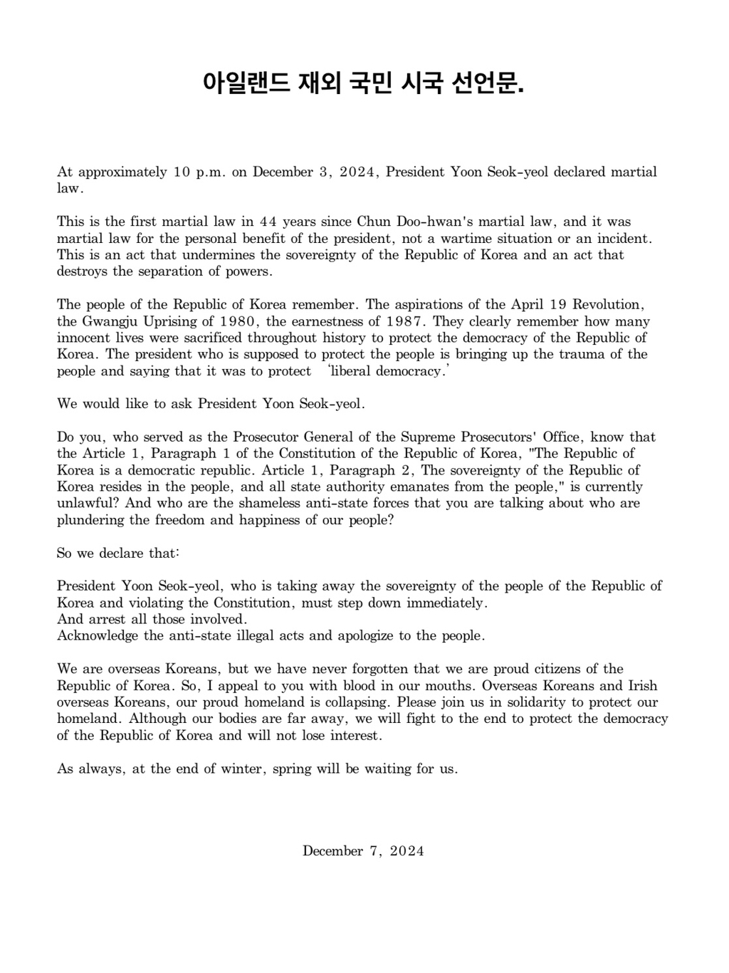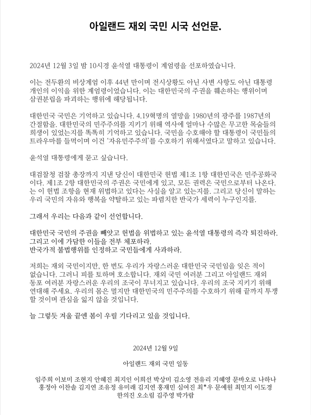 [흥미돋]아일랜드 재외국민 탄핵시위 및 시국선언문 작성자윤석열을부검하라|작성시간24.12.09|조회수4,328 목록 댓글 6 글자크기 작게가 글자크기 크게가 출처: 여성시대 윤석열을부검하라전 세계 각지에서 다들 목소리 높이고시위하자고 한인들끼리 뭉치고 있음🚨윤석열은 퇴진하라🚨문제시 윤석열탄핵 다음검색 현재 게시글 추가 기능 열기 북마크 공유하기 신고 센터로 신고 댓글 댓글 6 댓글쓰기 답글쓰기 댓글 리스트 작성자앞서서나가니산자여따르라 | 작성시간 24.12.09 멋있다👏👏👏👏👏 작성자평세 | 작성시간 24.12.09 ㅠㅠ 작성자봄날의햇살 최수연 | 작성시간 24.12.09 우린 교민방은 오히려 정치 얘기 하지 말라고 입틀막하거나 대놓고 옹호글 올림 ㅠㅠ너무 부럽다 작성자건배성림 | 작성시간 24.12.09 아일랜드ㅜㅜ 작성자여자만있으면됨 | 작성시간 24.12.09 멋지다! 댓글 전체보기