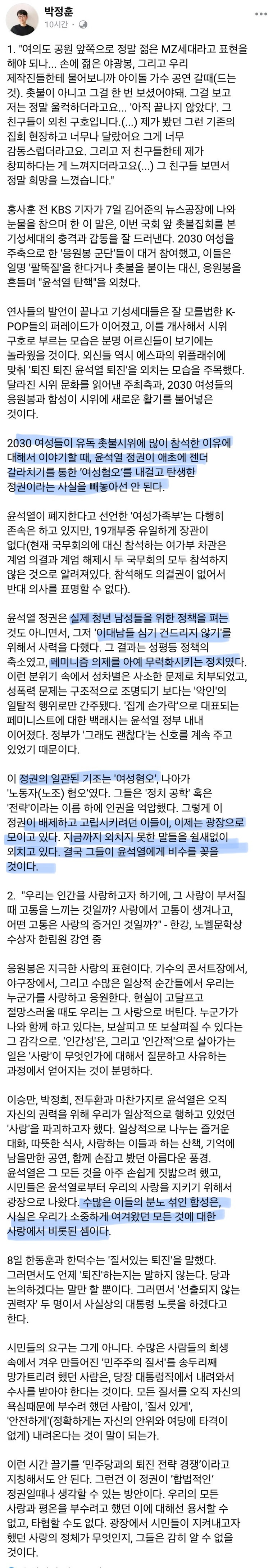 [흥미돋]응원봉 집회와 관련한 오마이뉴스 기자 페이스북 작성자윤두환나가|작성시간24.12.09|조회수10,181 목록 댓글 39 글자크기 작게가 글자크기 크게가 출처: 여성시대 윤두환나가https://m.facebook.com/story.php?story_fbid=27903447992634235&id=100001872249460로그인 또는 가입하여 보기Facebook에서 게시물, 사진 등을 확인하세요.www.facebook.com문제시 고칠게요 둥글게 알려줘 💙 다음검색 현재 게시글 추가 기능 열기 북마크 공유하기 신고 센터로 신고 댓글 댓글 39 댓글쓰기 답글쓰기 댓글 리스트 작성자asap baby hurry up dont be lazy | 작성시간 24.12.09 참기자 작성자lemonasta | 작성시간 24.12.09 뭔가 글만 읽었는데도 위로가 된다 작성자12시32분 | 작성시간 24.12.09 좋은 글이다 잘 읽었어 작성자할수있다이 | 작성시간 24.12.09 진짜 102030 여성들 천지였어 어제도 발언하는데 10대 학생들도 많아서ㅠㅠㅠ 울컥하더라 작성자좀짱 | 작성시간 24.12.09 글 너무 좋다ㅠ 눈물 고임 멋지다 여성들 댓글 전체보기