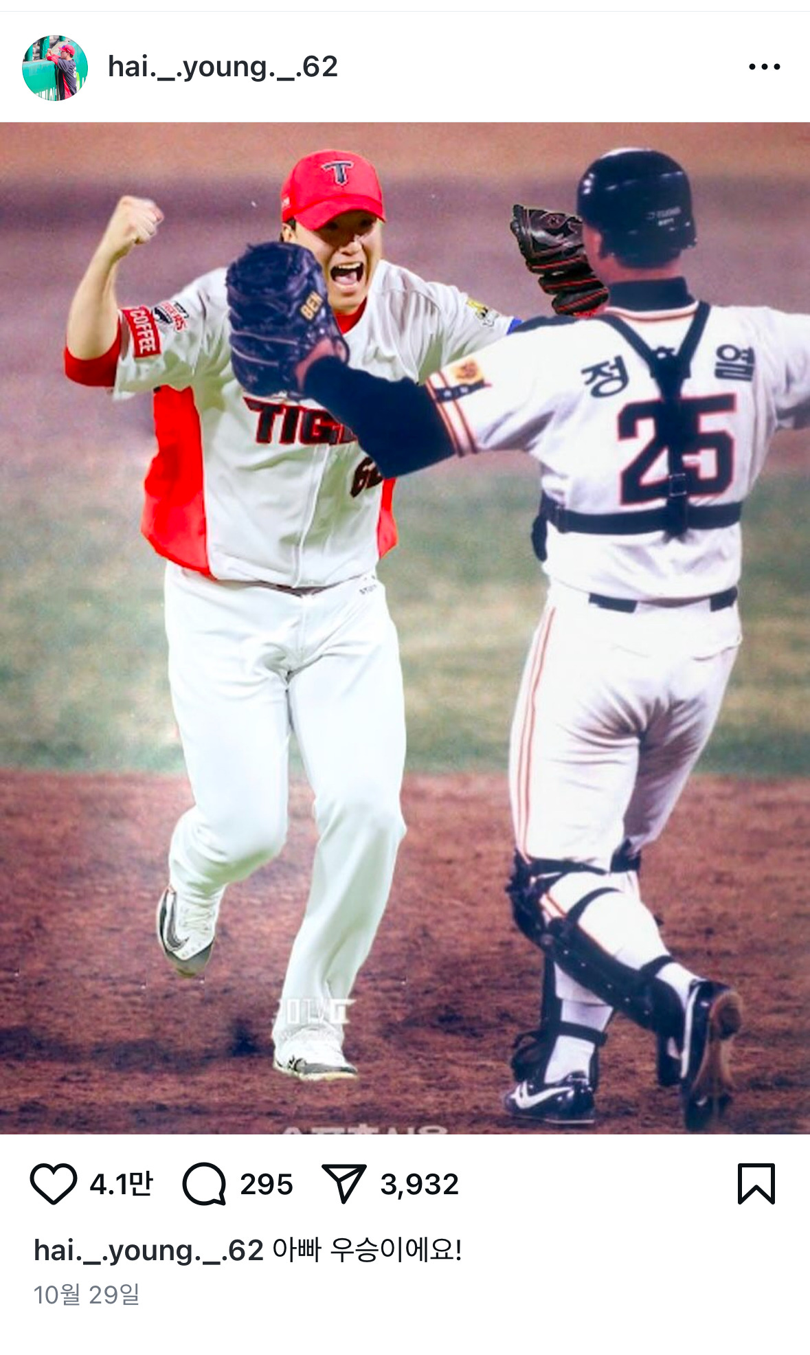 기아 타이거즈 우승 이후 이 사진으로 쩌리에도 글 올라왔었던 팀 마무리 투수임