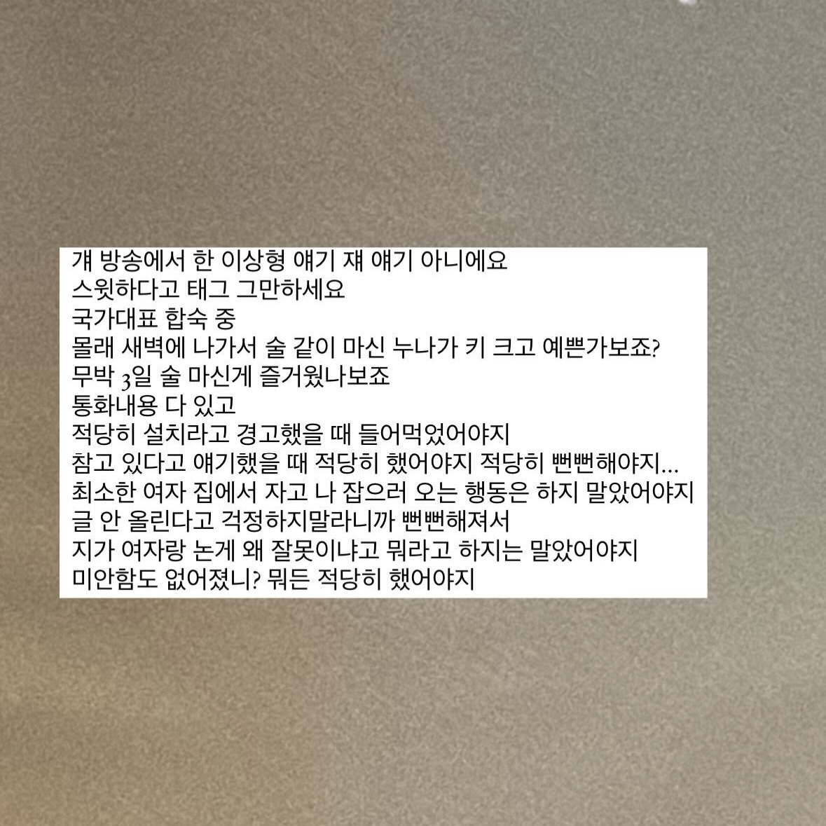 - 국가대표 합숙 중에 몰래 나가서 술 마심 (그것도 여자친구 있는 사람이 여자랑)