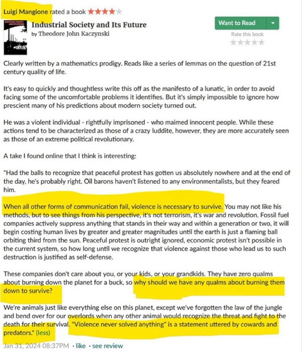 책 리뷰 사이트에 시어도어 카진스키 (유나바머) 저서를 읽고 리뷰 적은 게 나옴. 카진스키 추종자였을지도?
