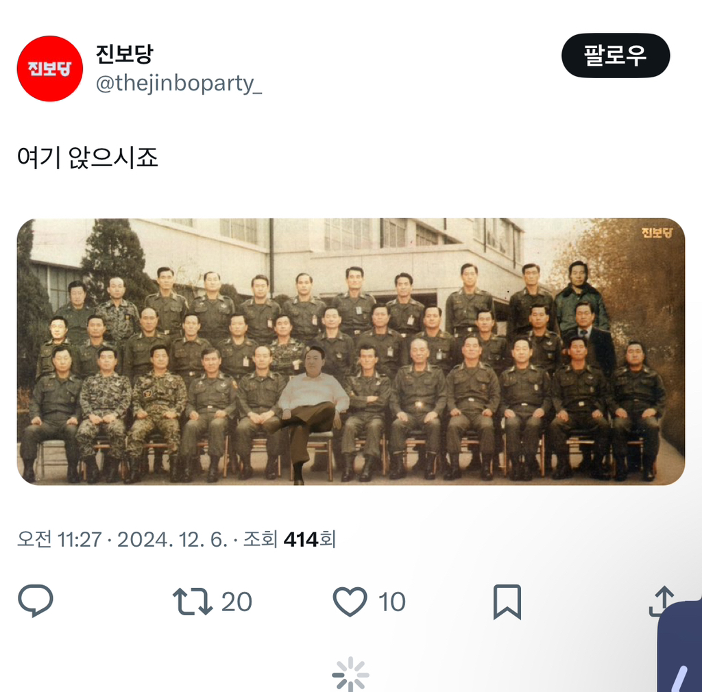 [스크랩] [흥미돋]방금 올라온 진보당 트윗 작성자dtdewf|작성시간24.12.10|조회수11,252 목록 댓글 25 글자크기 작게가 글자크기 크게가 출처: https://x.com/thejinboparty_/status/1864859288629579821?s=46X의 진보당님(@thejinboparty_)여기 앉으시죠x.com 다음검색 스크랩 원문 : *여성시대* 차분한 20대들의 알흠다운 공간 현재 게시글 추가 기능 열기 북마크 공유하기 신고 센터로 신고 댓글 댓글 25 댓글쓰기 답글쓰기 댓글 리스트 작성자내란의힘 소멸에 진심 | 작성시간 24.12.10 미필 윤석열 인생샷 ㄷㄷ 작성자흐물흐물 | 작성시간 24.12.10 미필 존나 출세했네. 윤석열 본인은 저 합성사진 존나 좋아할듯. 작성자포케광인 | 작성시간 24.12.10 ㅋㅋㅋㅋㅋㅋㅋ 미필이 센터네 작성자과거의나도나야 | 작성시간 24.12.10 역시 작성자추운데다들감기조심해 | 작성시간 24.12.10 미필이 센터라.. 호오 흥미롭구만 댓글 전체보기