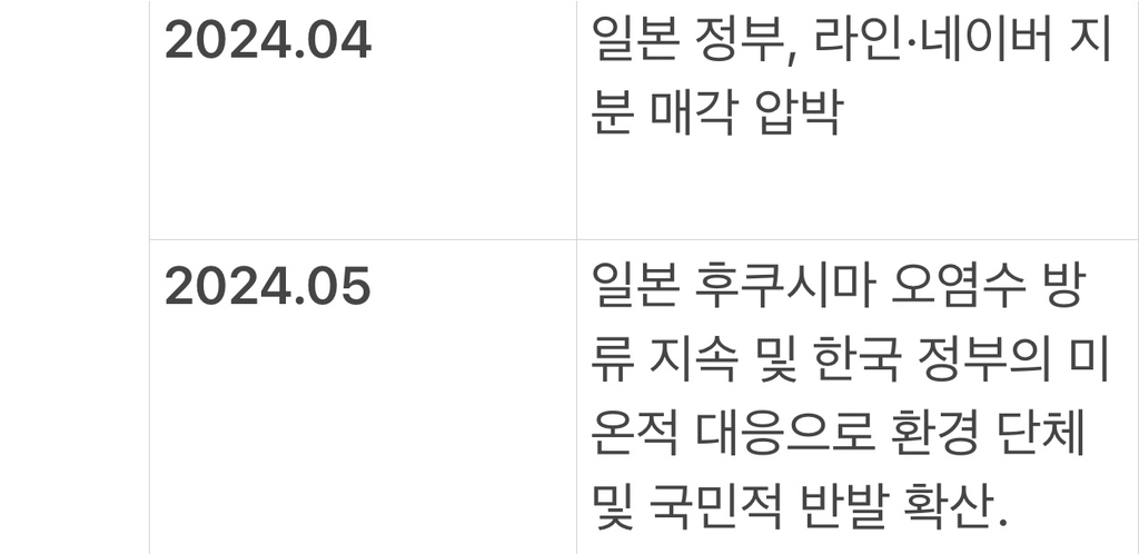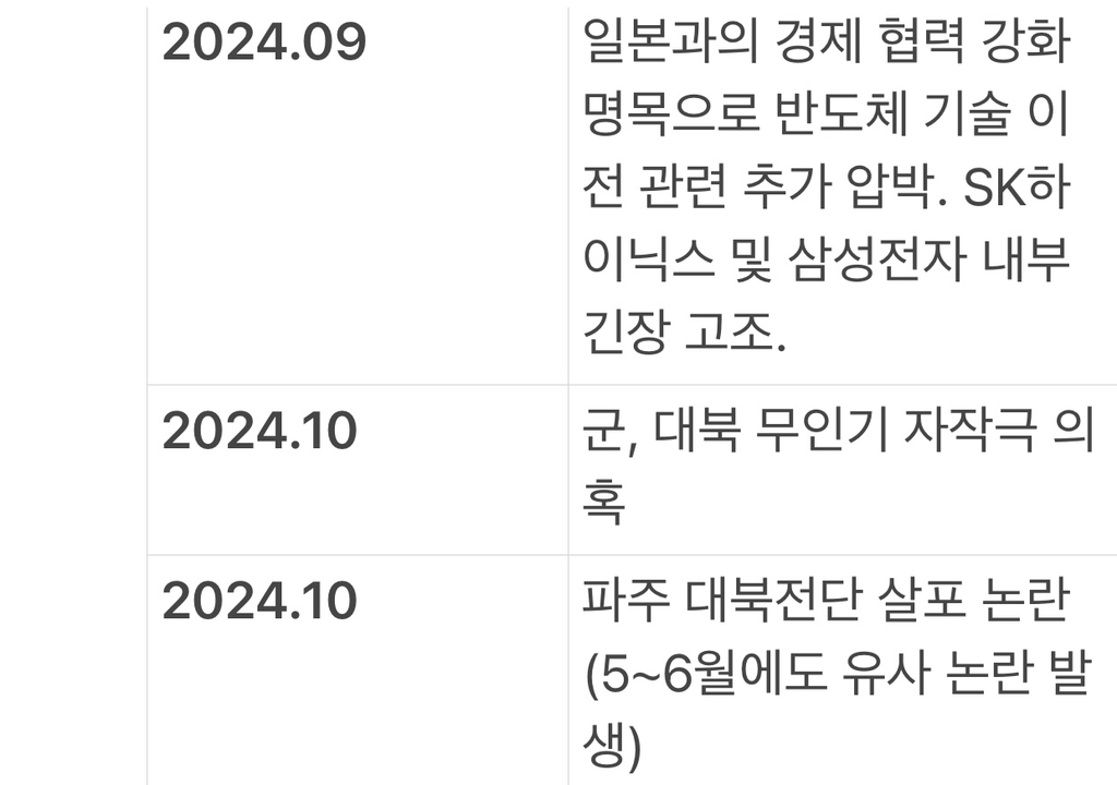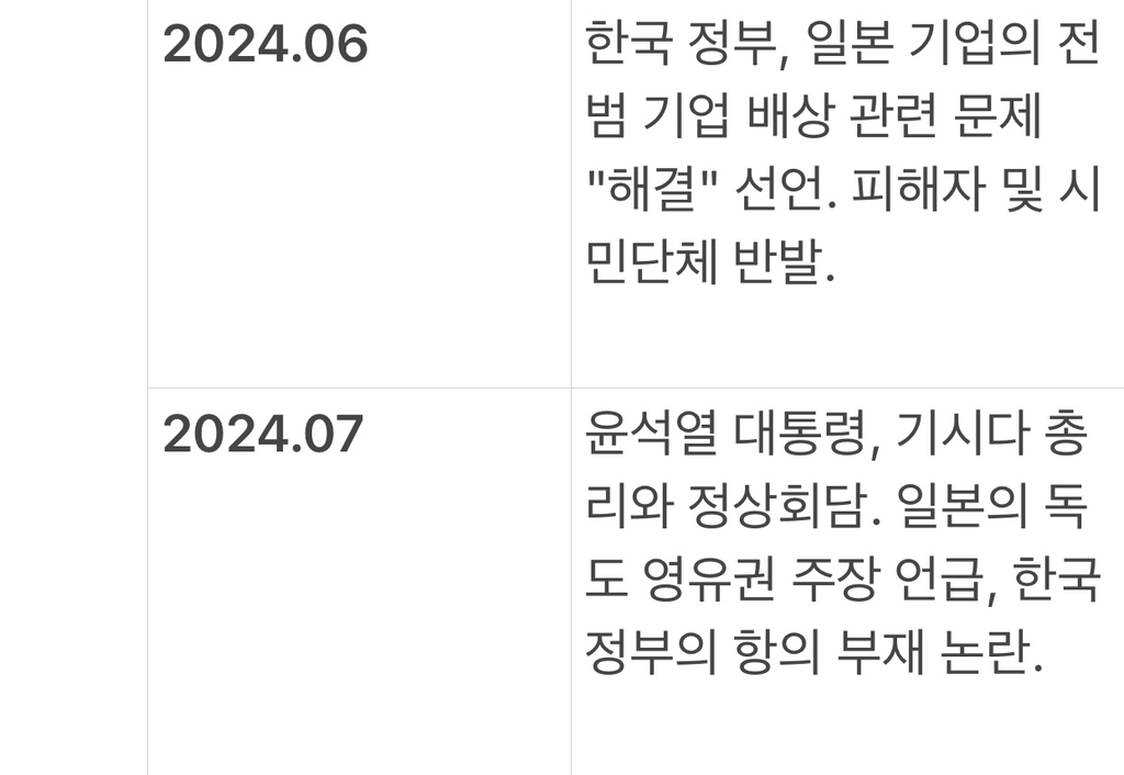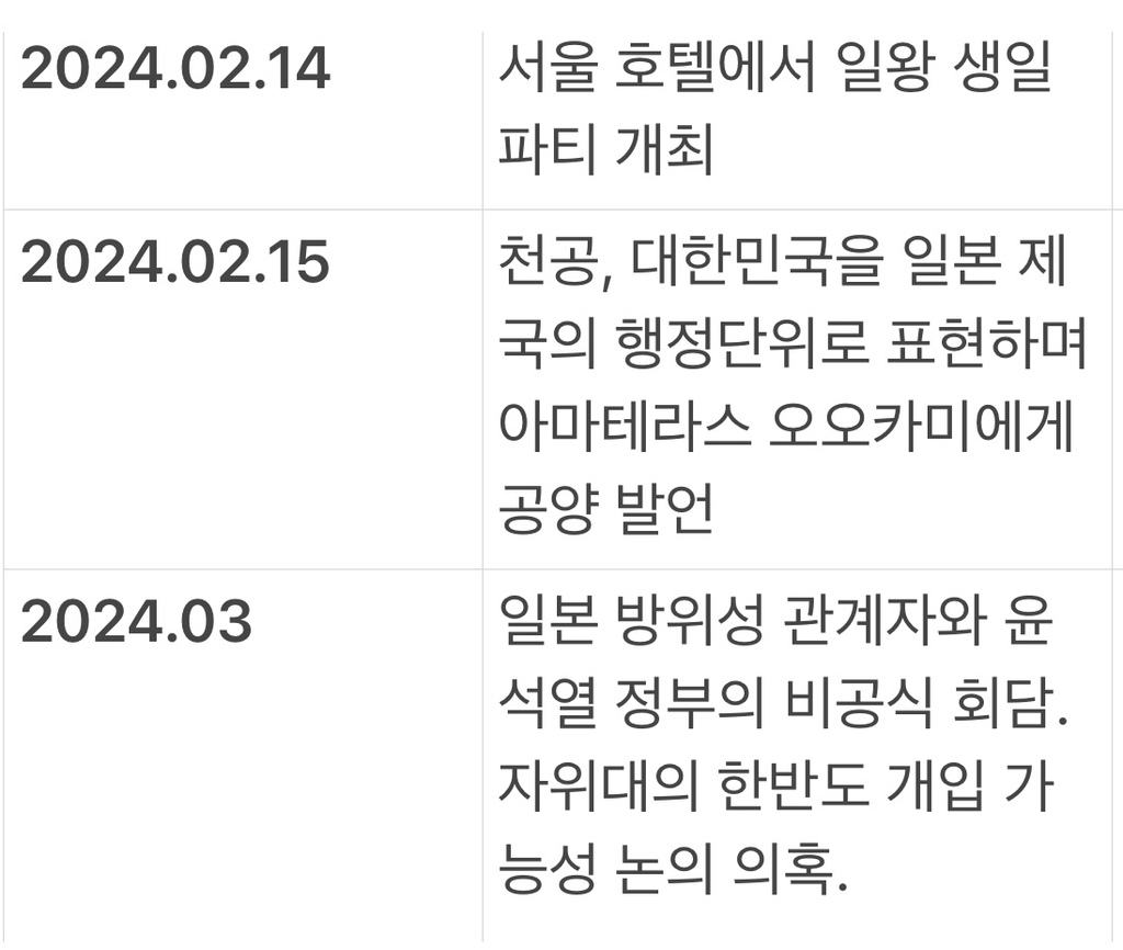 [칵.cxxx]2024년 윤정부 - 일본 타임라인 정리해옴 작성자하와이안파파야|작성시간24.12.11|조회수2,737 목록 댓글 13 글자크기 작게가 글자크기 크게가 출처: 하와이안파파야가독성 떨어져서 미안...핸드폰으로 해서 최선임 ㅠㅠ올해 이슈만 모아서 나랑 챗gpt가 힘을 모아 정리함Gpt 말투라는 점 양해 부탁합니다. 계엄 내용 좀 섞여있음.*일왕 생일파티 저거 작년에도 했음*자위대 발언도 이미 2022년에 했음.*일본이 지금 정치적으로 압박 계속 넣는 중임. 다음검색 현재 게시글 추가 기능 열기 북마크 공유하기 신고 센터로 신고 댓글 댓글 13 댓글쓰기 답글쓰기 댓글 리스트 해당 댓글은 작성자와 운영진만 볼 수 있습니다. 작성자영앤리치루 | 작성시간 24.12.11 개자식아 작성자망고젤리맛 | 작성시간 24.12.11 매국노들 작성자나경원일본인 | 작성시간 24.12.12 미쳤다.... 친일파라 그냥 과거사만 지우려는게 아님..... 이건 식민지 재시도한거임... 답댓글 작성자나경원일본인 | 작성시간 24.12.12 핫플돼라... 댓글 전체보기