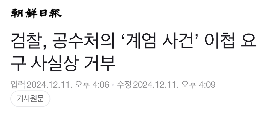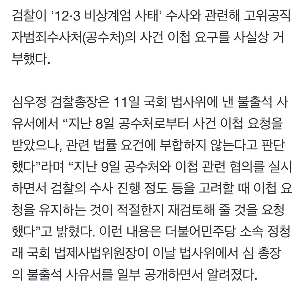 [여시뉴스데스크]검찰, 공수처의 ‘계엄 사건’ 이첩 요구 사실상 거부 작성자소리앙|작성시간24.12.11|조회수1,372 목록 댓글 27 글자크기 작게가 글자크기 크게가 출처: https://naver.me/xTTuXMnb검찰, 공수처의 ‘계엄 사건’ 이첩 요구 사실상 거부검찰이 ‘12·3 비상계엄 사태’ 수사와 관련해 고위공직자범죄수사처(공수처)의 사건 이첩 요구를 사실상 거부했다. 심우정 검찰총장은 11일 국회 법사위에 낸 불출석 사유서에서 “지난 8일 공n.news.naver.com전문출처 다음검색 현재 게시글 추가 기능 열기 북마크 공유하기 신고 센터로 신고 댓글 댓글 27 댓글쓰기 답글쓰기 댓글 리스트 작성자전기장판에서놀기 | 작성시간 24.12.11 꺼져 진짜 한명 한명 다 탄핵당하고 싶냐 싸물어 작성자죽어그냥죽고또죽어 | 작성시간 24.12.11 아 이새끼들이 돌았나 작성자에이벨1689 | 작성시간 24.12.11 검찰 시위하자 작성자정신ㄴr간선비 | 작성시간 24.12.11 걍 재ㅒ네도 탄핵시키자 ㅅㅂ 작성자가마솥 누룽지 | 작성시간 24.12.11 검찰 없애고 다시 만들자 ㅅㅂ 댓글 전체보기