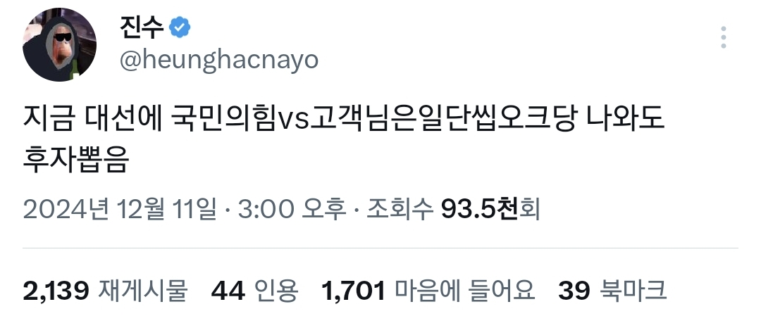 작성자한동훈 가발 벗는 날=구속되는 날 작성시간 24.12.11 ㅅㅂ 지금 국힘에서 세종대왕 나와도 안 뽑고 민주당에서 옆집 이웃 아무나 나와도 뽑는다