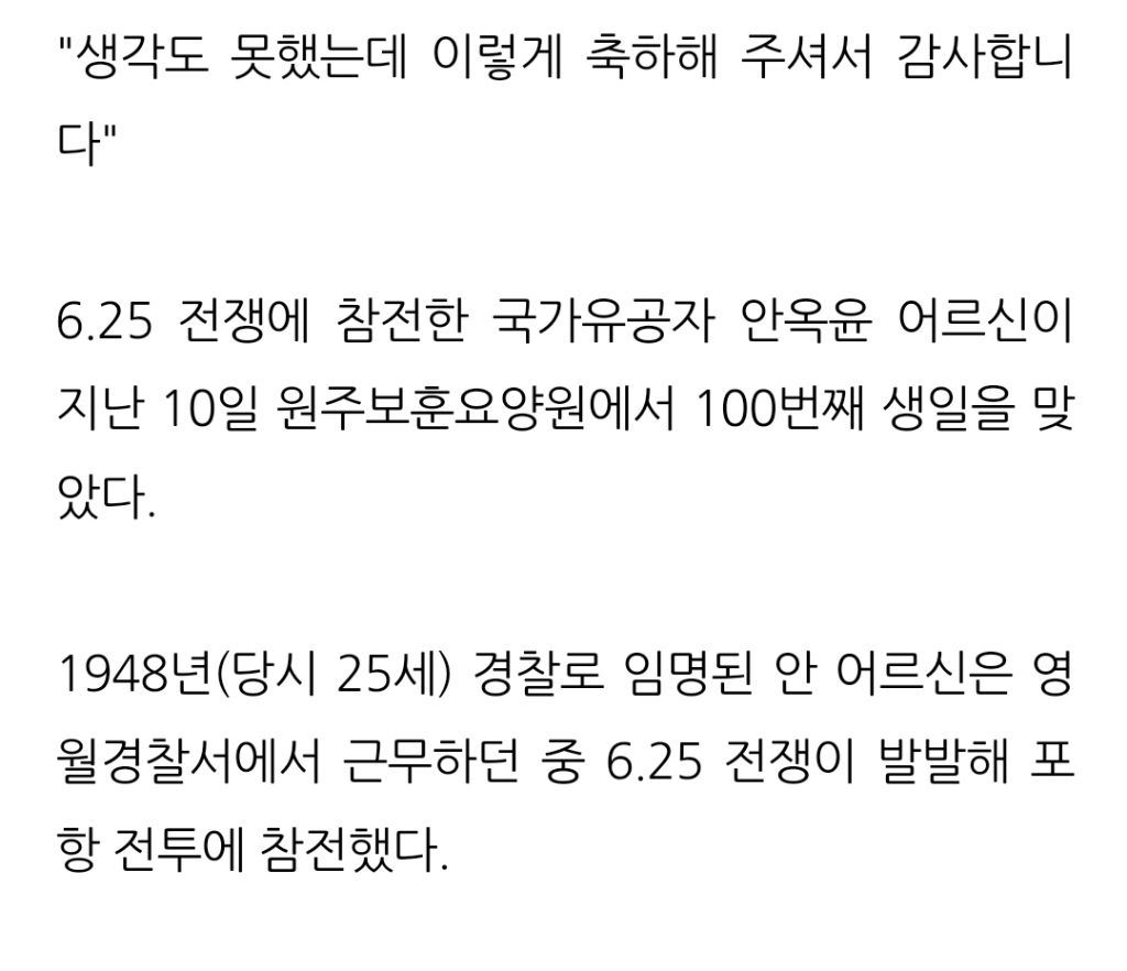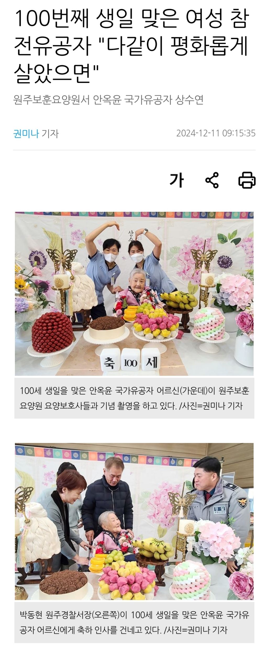 [여시뉴스데스크]100번째 생일 맞은 여성 참전유공자 "다같이 평화롭게 살았으면" 작성자천리길|작성시간24.12.11|조회수777 목록 댓글 7 글자크기 작게가 글자크기 크게가 출처: https://news.mtn.co.kr/news-detail/2024121106565311209100번째 생일 맞은 여성 참전유공자 "다같이 평화롭게 살았으면""생각도 못했는데 이렇게 축하해 주셔서 감사합니다"6.25 전쟁에 참전한 국가유공자 안옥윤 어르신이 지난 10일 원주보훈요양원에서 100번째 생일을 맞았다.1948년(당시 25세) 경찰로 임명된 안 어news.mtn.co.kr이하 생략전문 출처로 다음검색 현재 게시글 추가 기능 열기 북마크 공유하기 신고 센터로 신고 댓글 댓글 7 댓글쓰기 답글쓰기 댓글 리스트 작성자버스기사여시 | 작성시간 24.12.11 안옥윤 어르신이요!!@@??? 생신 축하드립니다!!(내가 놀란 이유:영화 암살에서 전지현역 극중이름이 안옥윤) 답댓글 작성자북프로텍터 | 작성시간 24.12.11 나도 그 생각함 ㅋㅋㅋㅋ 작성자북프로텍터 | 작성시간 24.12.11 생신 축하드립니다 작성자흠냥냥 | 작성시간 24.12.11 축하드립니다!! 건강하시고 항상 감사하는 마음 잊지않겠습니다ㅠㅠ 작성자동현이는 가정교육을 못받았어 | 작성시간 24.12.11 생신축하드립니다!!!💕💕 댓글 전체보기