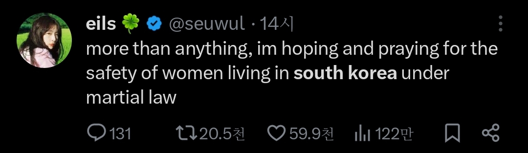 나는 그 무엇보다도, 계엄령 아래 한국에 사는 여성들이 안전하기를 바라.