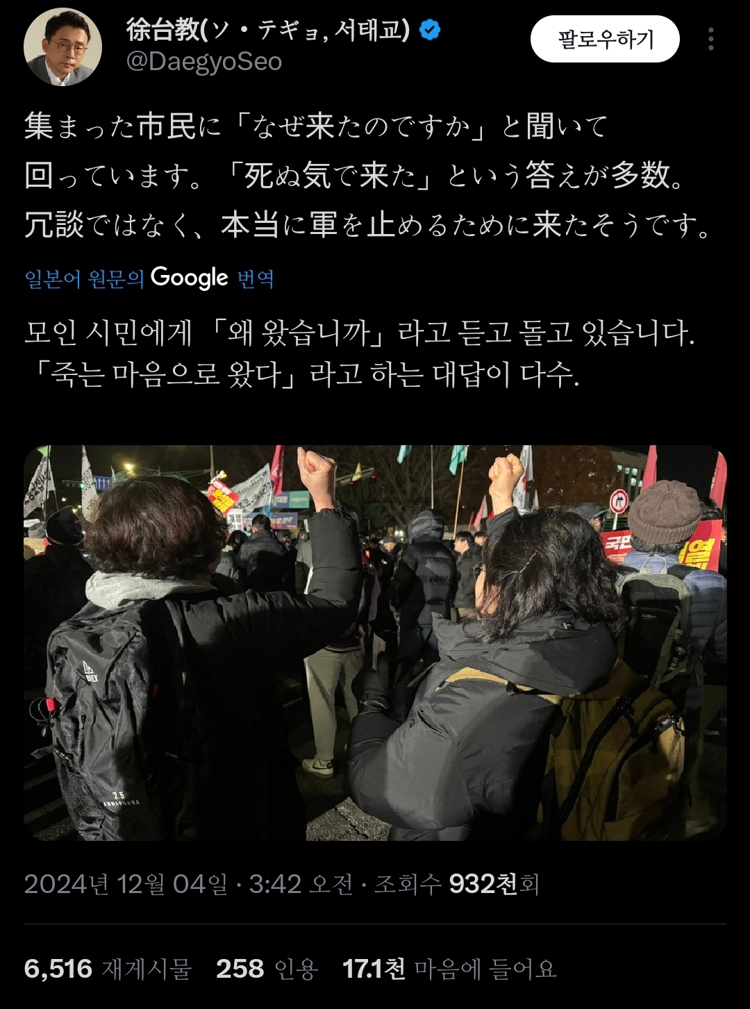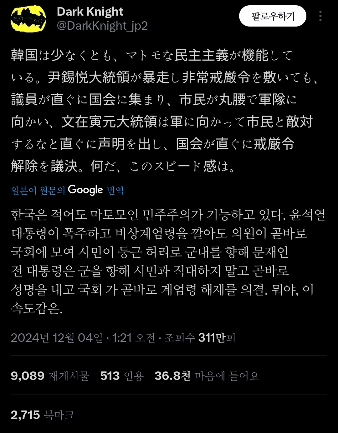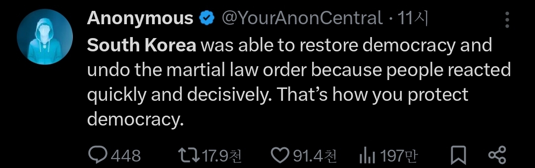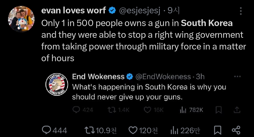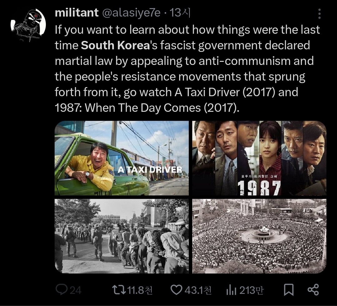 인용 트윗 : 한국은 500명 중 한 명만이 총을 소유하고 있지만, 그들은 몇 시간 만에 군사를 대동한 우익 정부가 집권하는 걸 막았음;