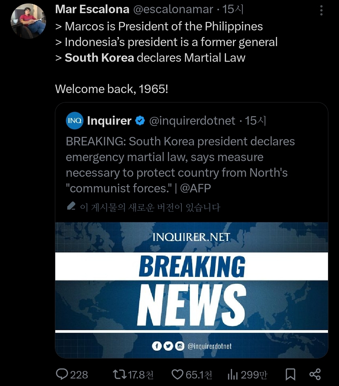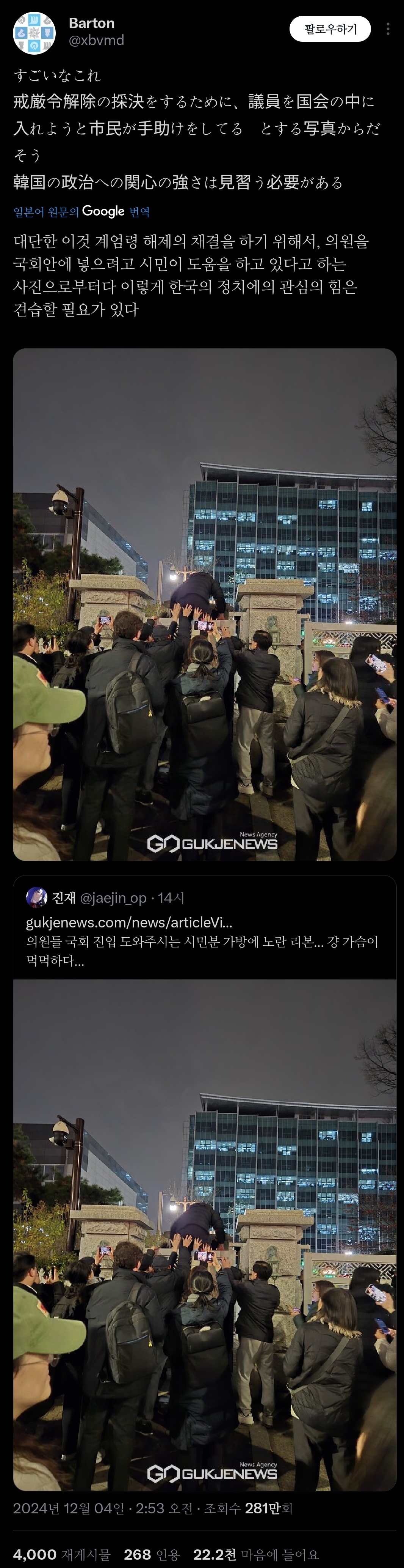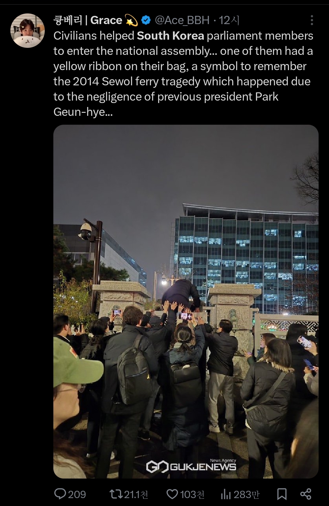인용 트윗 : 한국은 500명 중 한 명만이 총을 소유하고 있지만, 그들은 몇 시간 만에 군사를 대동한 우익 정부가 집권하는 걸 막았음;