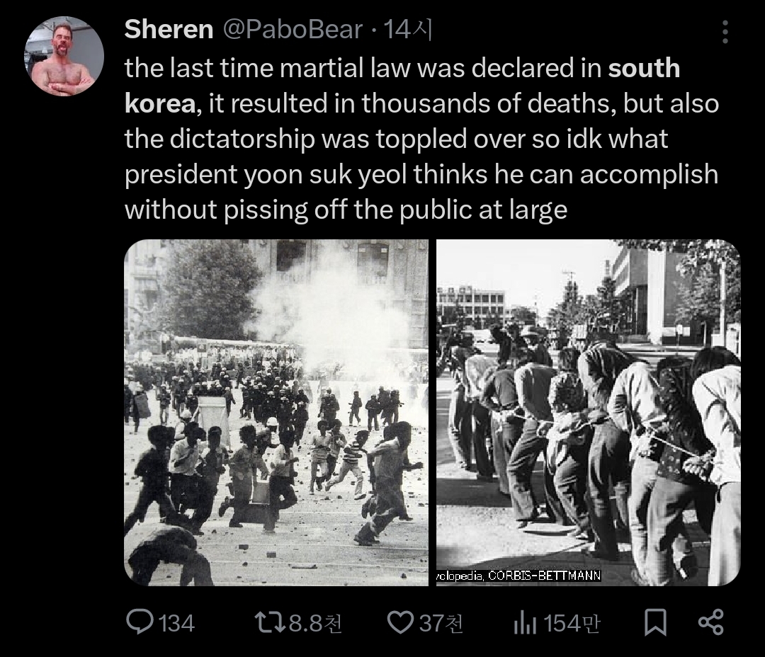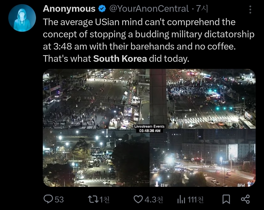 미국인 평균은 새벽 3시 48분에 무기랑 커피도 없이 맨몸으로 군사 독재를 막아야 한다는 개념이 없겠지, 근데 오늘 한국은 함.