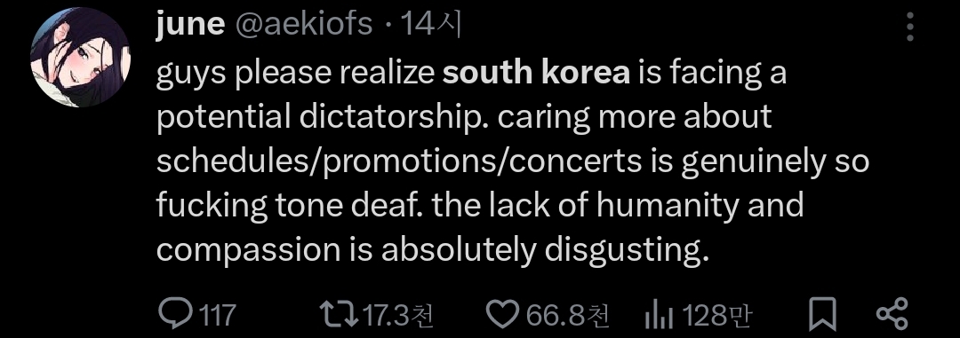 얘들아 한국이 지금 독재 정권에 직면해 있는데 너네 스케쥴/프로모/콘서트 걱정 좀 하지 마라. 인간의 연민성 부족은 하여튼 ㅈㄴ역겨움
