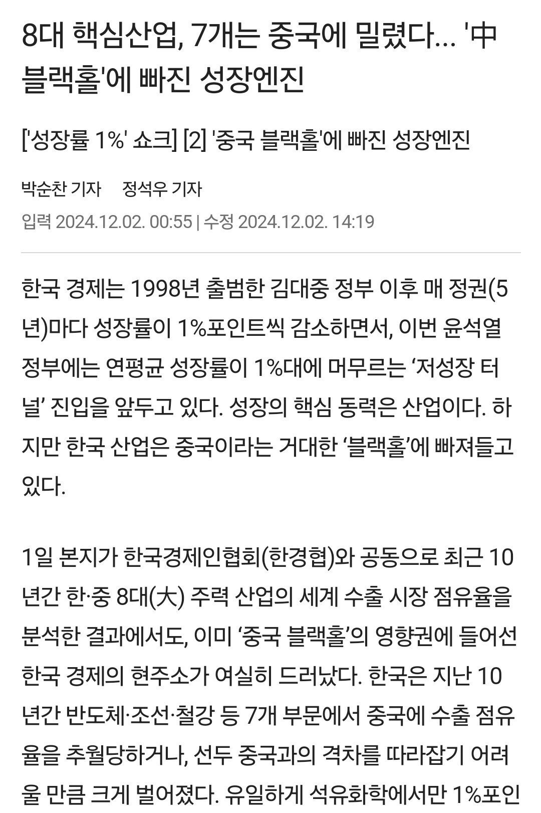 [ 이미 한국 8개 주력산업에서 7개가 중국에게 따임 ]
