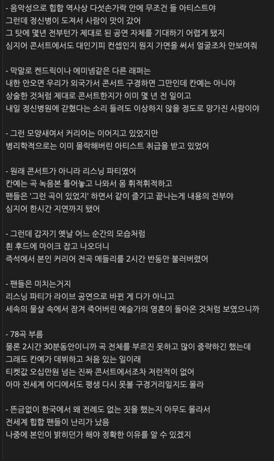 [스크랩] [흥미돋]이번 칸예웨스트 공연이 난리인 이유 요약 작성자머띿오오|작성시간24.12.13|조회수12,152 목록 댓글 24 글자크기 작게가 글자크기 크게가 출처: 여성시대 쉬고싶은밤+ 단순 리스닝 파티라 표값이 88000원이였는데 78곡을 불러서 한곡당 천원이라는 거의 코노수준의 가격..+유튜브 실시간 송출로 파급력 커짐 다음검색 스크랩 원문 : *여성시대* 차분한 20대들의 알흠다운 공간 현재 게시글 추가 기능 열기 북마크 공유하기 신고 센터로 신고 댓글 댓글 24 댓글쓰기 답글쓰기 댓글 리스트 작성자숨쉬듯배고프네 | 작성시간 24.12.13 한시간 늦은 저거도 이빨치료한거라며ㅋㅋㅋ 작성자우나나나 | 작성시간 24.12.13 코노ㅋㅋㅋㅋㅋㅋㅋㅋ 작성자나누누 | 작성시간 24.12.13 ㅋ 와 성범죄자를 작성자주문하신 아이야 | 작성시간 24.12.13 뭐하다 정신병걸렸대...... 약했나ㅠㅠ 신은 다 주진 않으시는구나.... 재능이 아깝다 작성자닉네임 뭐 | 작성시간 24.12.13 저 글쓴이 인생 영화 조커 1일 것 같음 댓글 전체보기