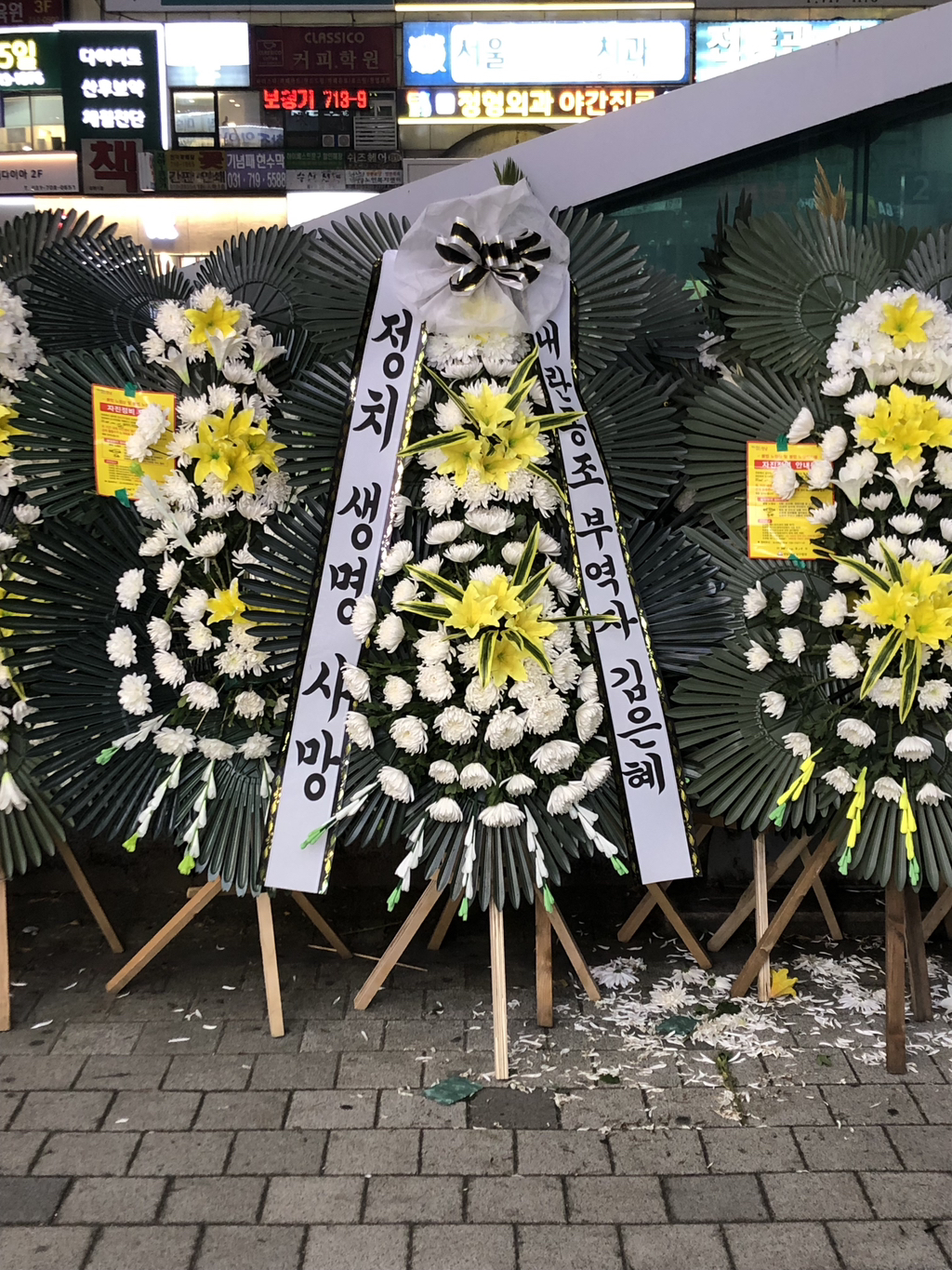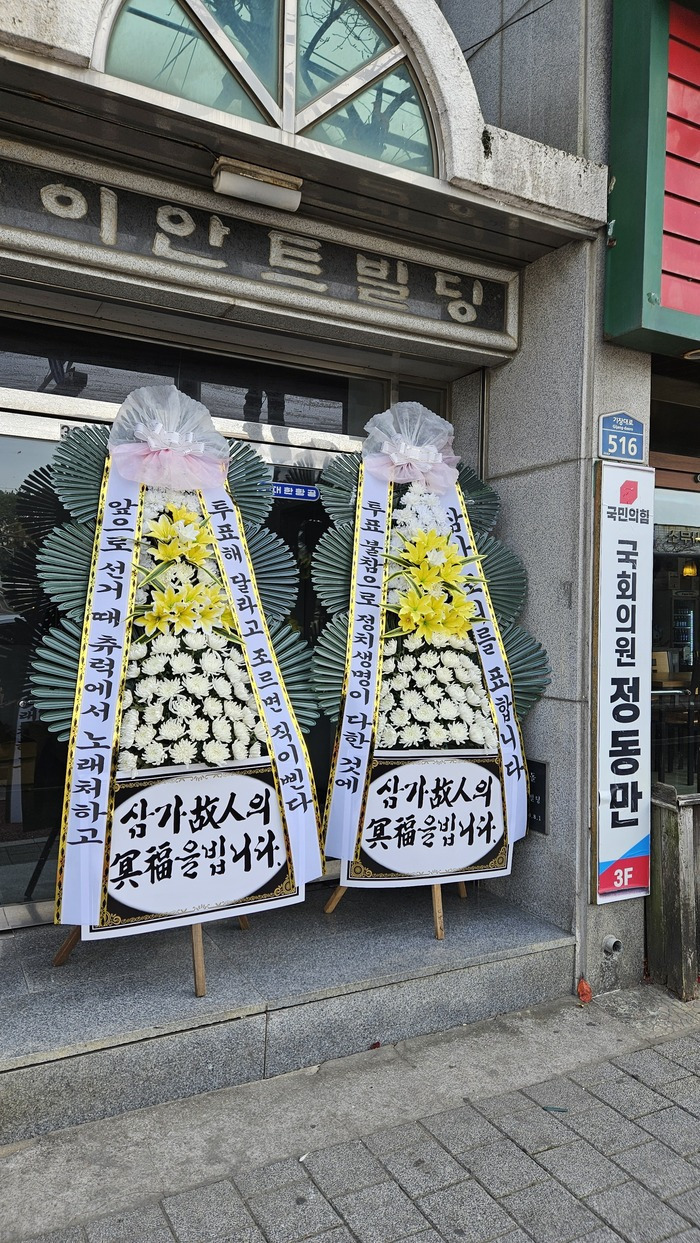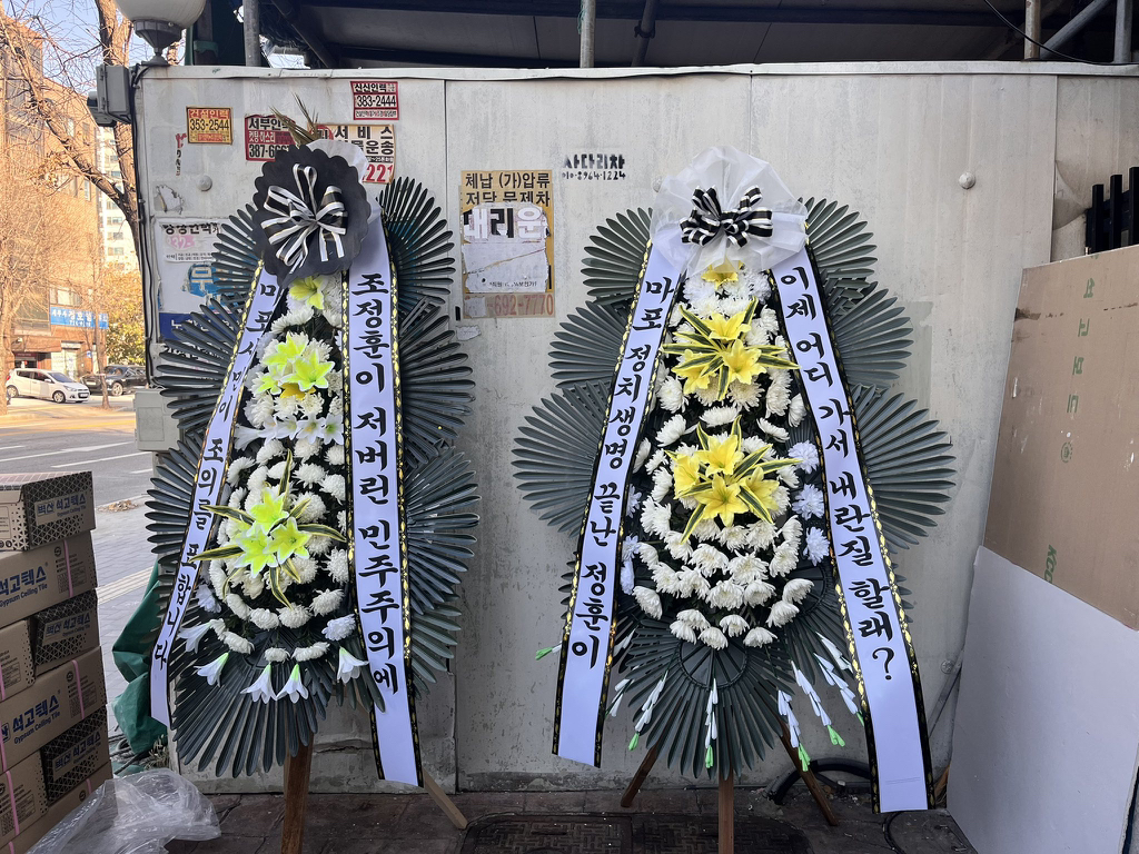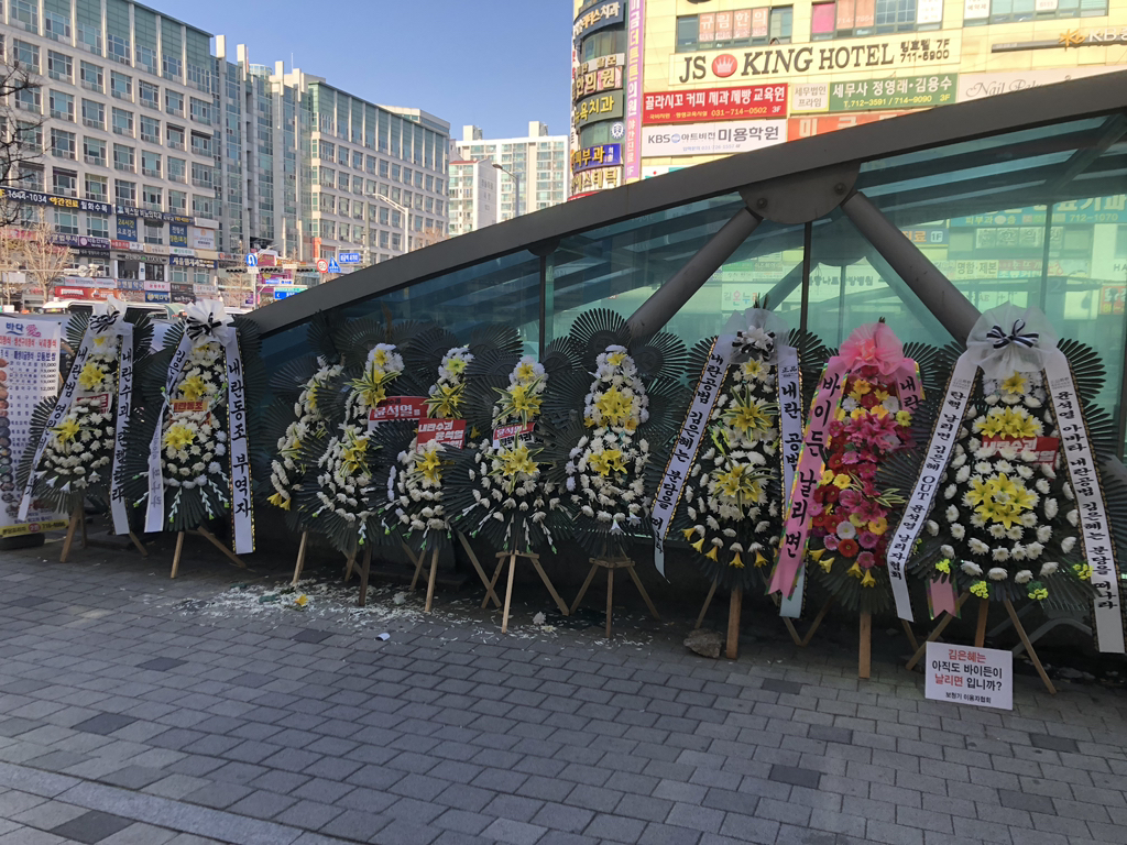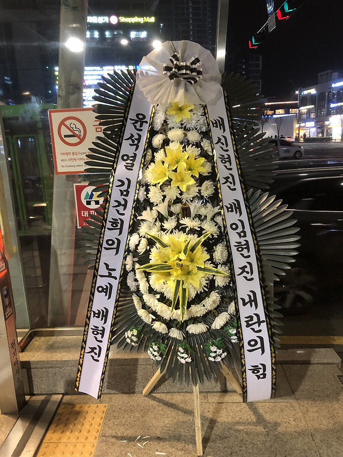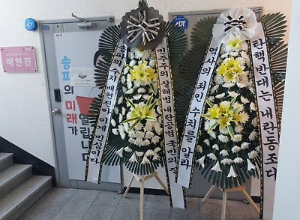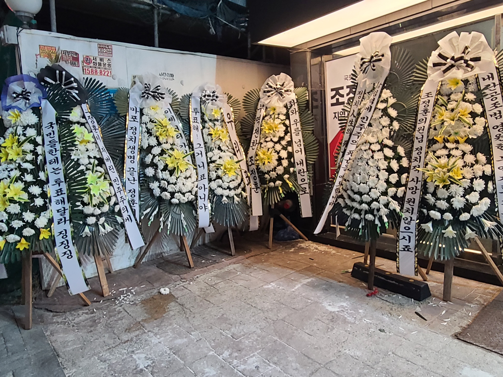 (배현진 인기 많네요 바로바로 치워서 그런지 새로운 화환들이 많습니다.)