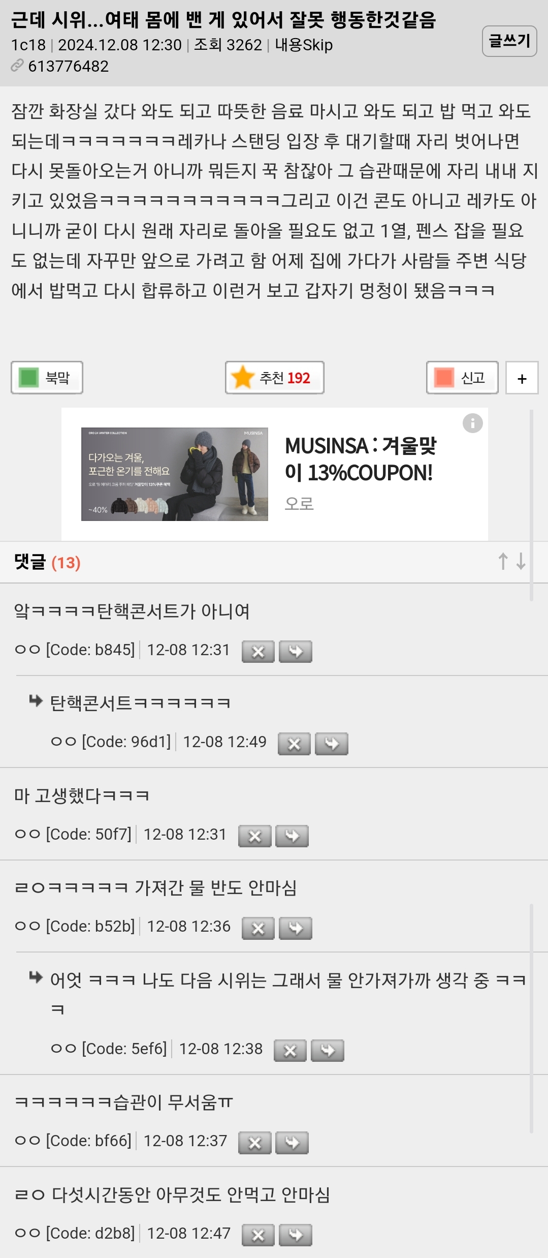 [스크랩] [배꼽의행방]?? : 근데 시위...여태 몸에 밴 게 있어서 잘못 행동한것같음 작성자책덕|작성시간24.12.14|조회수22,646 목록 댓글 50 글자크기 작게가 글자크기 크게가 출처: https://hygall.com/613776482는 흔한 휀걸들의 본능 다음검색 스크랩 원문 : *여성시대* 차분한 20대들의 알흠다운 공간 현재 게시글 추가 기능 열기 북마크 공유하기 신고 센터로 신고 댓글 댓글 50 댓글쓰기 답글쓰기 댓글 리스트 답댓글 작성자공우진 | 작성시간 24.12.14 오 ㄷㄷ 진짜 동안이시다 작성자Finale | 작성시간 24.12.14 ㅋㅋ자리생기면 다들 무한전진이얔ㅋㅋㅋㅋㅋㅋㅋㅋㅋㅋㅋㅋ귀여움 작성자엘리너셀스트롭 | 작성시간 24.12.14 앗쉬 나도 방금 깨달음;; 작성자berryvery | 작성시간 24.12.14 ㄹㅇ 나 화장실 갈까봐 물 안 마심ㅜㅜㅋㅋㅋㅋㅋ 작성자하암품 | 작성시간 24.12.14 대단한 휀걸들💜👑 댓글 전체보기